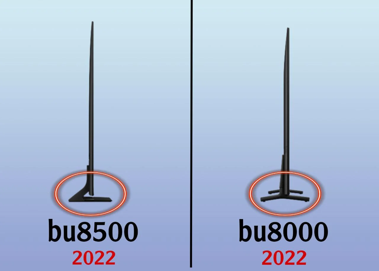 این دو مدل تلویزیون با هم شباهت ها و تفاوت هایی دارند. اولین تفاوت انها در پایه این دو مدل تلویزیون می باشد. تلویزیون bu8000 دارای پایه های دو طرفه ای می باشند که در اطراف تلویزیون قرار می گیرند و حالتی مابین تخت و دو شاخه ای می باشد. در مقابل تلویزیون bu8500 دارای پایه های مرکزی می باشد و در وسط تلویزیون قرار می گیرد. و به نسبت تلویزیون bu8000 از پهنا و عرض کمتری برخوردار می باشد و به راحتی روی میز های کوچک هم قرار می گیرد. در زیر می توانید تفاوت این دو مدل پایه را مشاهده کنید. پایه های هر دو مدل تلویزیون بسیار محکم و بدون لرزش می باشند و سامسونگ ان را با رنگ مشکی طراحی کرده است. سامسونگ این تلویزیون ها رو با قابلیت نصب بر روی دیوار عرضه کرده است و اگر جز افرادی هستید که علاقمند به نصب تلویزیون بر روی دیوار هستید می توانید به راحتی پایه ها را جدا کنید و به وسیله براکت های مناسب تلویزیون ها را روی دیوار نصب کنید. این دو مدل تلویزیون هر دو دارای فریم و قاب بسیار باریک مشکی رنگ می باشند که حدود 1 سانتی متر ضخامت دارد و فوق العاده باریک می باشد و سبب جلوه ی شیک تلویزیون ها می باشد. در واقع فریم های باریک یک ویژگی بسیار جذابی برای تلویزیون ها می باشد. از لحاظ قسمت پشتی تفاوتی آنچنانی میانشان دیده نمی شود و قسمت چپ این تلویزیون ها به درگاه های ارتباطی اختصاص داده شده است. بدنه این تلویزیون ها از بهترین قطعات ساخته شده است. این دو مدل تلویزیون هر دو جز تلویزیون های باریکی محسوب می شوند و بدنه آنها بسیار ظریف دیزاین شده است که برای نصب روی دیوار گزینه مناسبی می باشند.