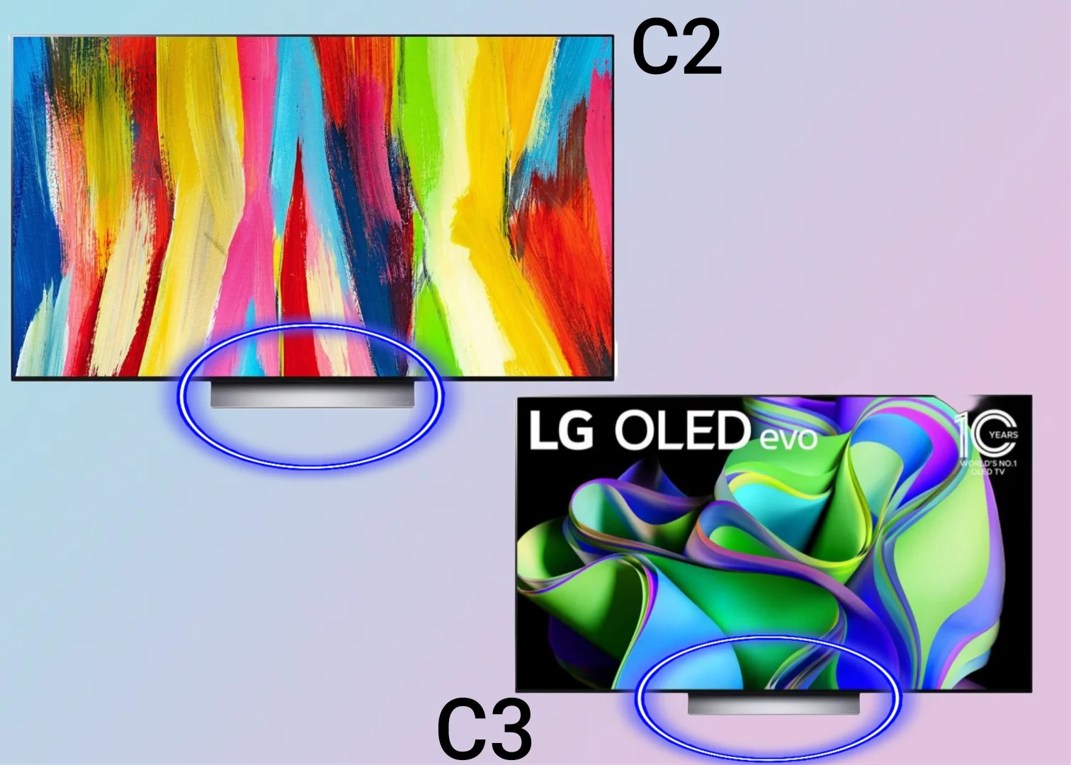 از مهمترین و اولین شباهت های میان این دو تلویزیون ال جی C2 و ال جی C3 می توان به طراحی ظاهری و دیزاین آنها اشاره کرد. تلویزیون ال جی C2 دارای فریم و قاب بی نهایت باریک می باشد که دور تا دور تلویزیون را فرا گرفته است. پایه تلویزیون ال جی C2 به صورت مرکزی می باشد که در وسط تلویزیون قرار گرفته است و با رنگ نقره ای دیزاین شده است. در مقابل تلویزیون ال جی C3 نیز به همین شیوه دارای قاب بسیار باریکی می باشد و همچنین پایه آن به صورت مرکزی در وسط تلویزیون همانند C2 با رنگ نقره ای قرار گرفته است. وقتی که از اطراف به این تلویزیون های C2 و C3 نگاه می کنید می توانید بازم متوجه شباهت بسیار زیاد میان این تلویزیون ها شوید. هر دو تلویزیون ها در واقع دارای بدنه ای نسبتا باریک در قسمت بالایی و در قسمت پایینی دارای ضخامت نسبتا بیشتری می باشند. از لحاظ طراحی قسمت پشتی نیز شاهد هیچگونه تفاوتی میان تلویزیون C2 و C3 نبودیم و از هر لحاظ شبیه به همدیگر می باشند. به طور کلی میان این دو تلویزیون C2 و C3 از لحاظ طراحی شاهد هیچ گونه تغییر و تفاوتی نبودیم. ال جی تلویزیون ال جی C3 در سال 2023 را دقیقاً همانند تلویزیون ال جی C2 در سال 2022 عرضه کرده است و تفاوتی چشمگیر و مهم را خلق نکرده است. در تصویر زیر می توانید متوجه شباهت تلویزیون C2 با C3 بشویید.