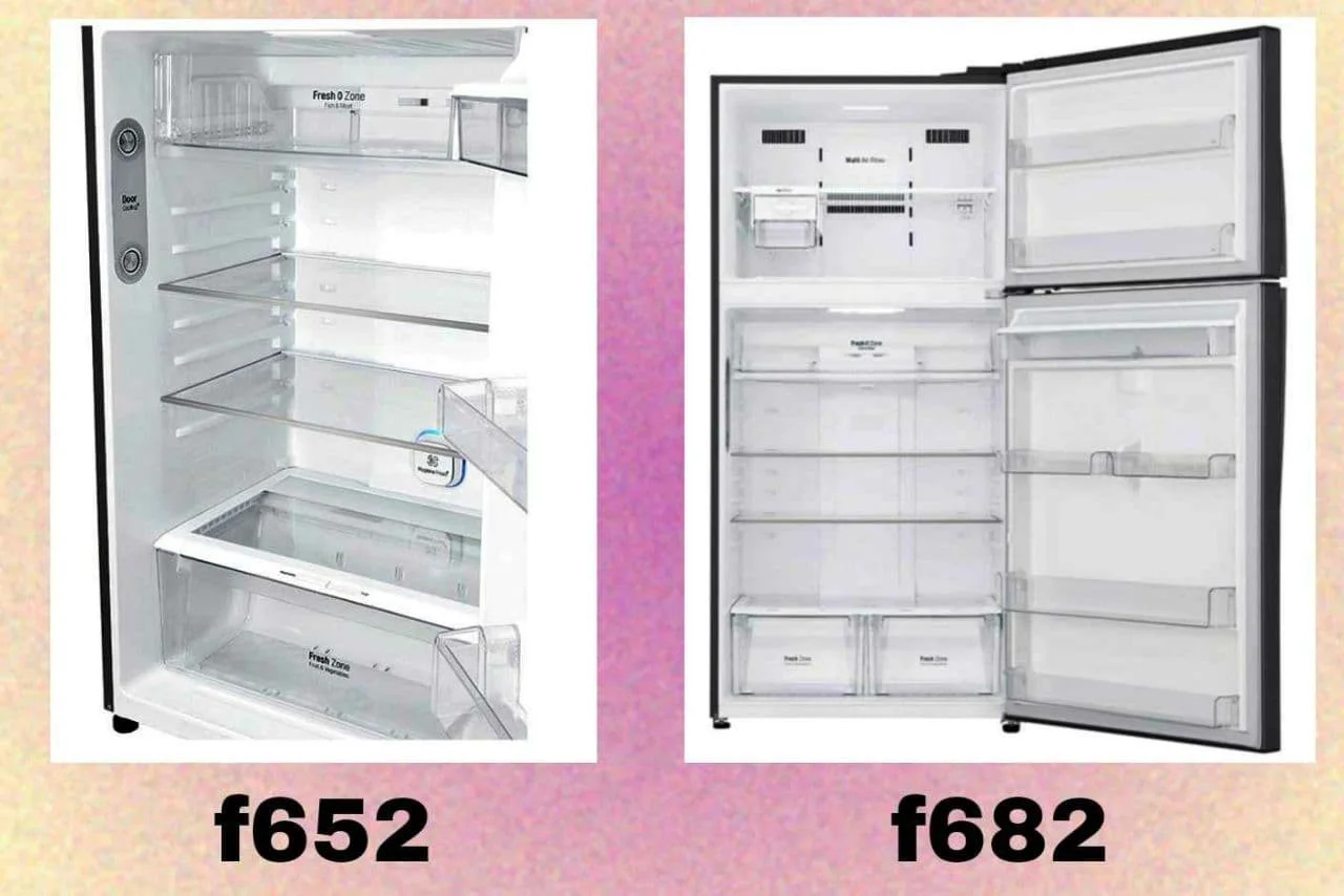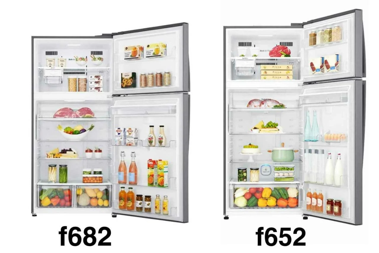 یخچال F682 دارای 4 طبقه، 2 کشو و 3 طبقه در درب آن و یخچال F652 دارای 4 طبقه، 1 کشو و 3 طبقه در درب آن می باشد. پس تنها تفاوت آن ها در 1 کشو می باشد. اما از نظر فریز هیچ تفاوتی با هم ندارند و هر دو مدل یخچال دارای 2 طبقه در فریزر و درب فریزر می باشند.