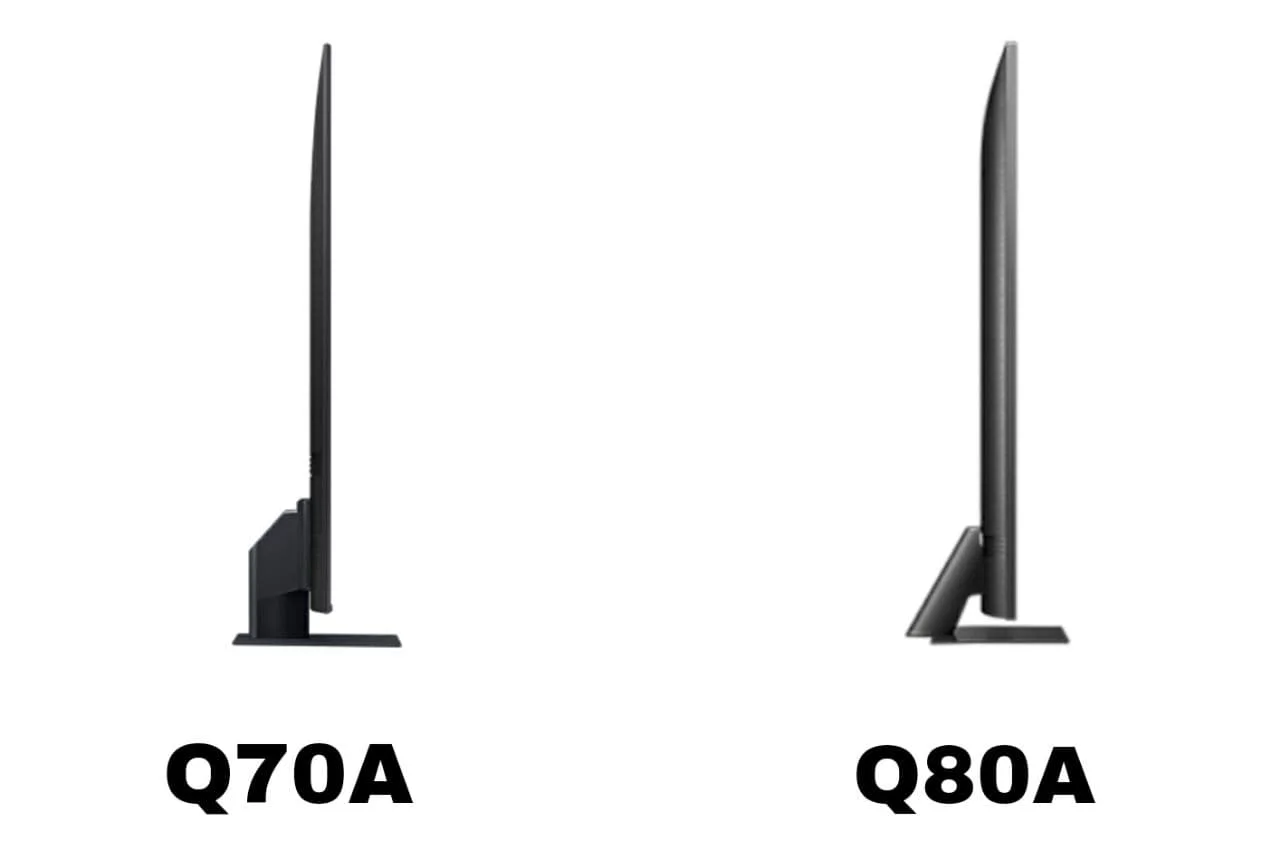 می توان گفت یکی از مهم ترین تفاوت های این دو مدل تلویزیون از نظر طراحی در ضخامت آن ها می باشد. تلویزیون Q80A دارای بدنه ای با ضخامت 6.2 سانتی متر می باشد در حالی که تلویزیون Q70A دارای ضخامت 2.8 سانتی متر می باشد. با نگاه کردن به بدنه آن ها راحت متوجه می شوید که ضخامت بدنه Q80A بسیار بیشتر از Q70A می باشد و تلویزیون Q70A بسیار باریک و ظریف می باشد و نصب تلویزوین های باریک بر روی دیوار قطعا نمای زیباتری را به خانه خواهد بخشید. پس در نتیجه تلویزیون Q70A با اینکه مدل پایینتر می باشد اما از نظر ضخامت توانسته امتیازی بیشتری را به نسبت تلویزیون Q80A کسب کند.