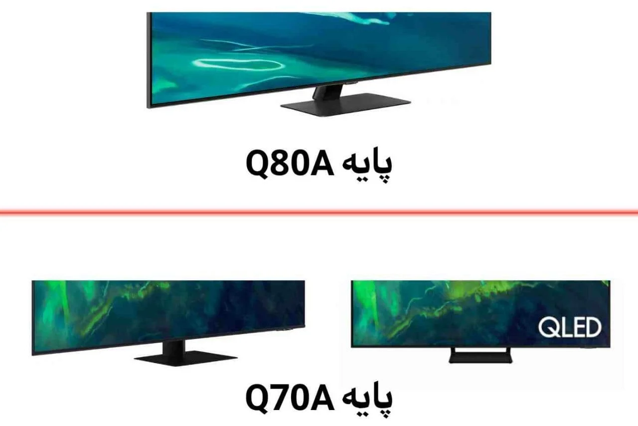 پایه ها نقش مهمی در جذابیت یک تلویزیون دارند. سامسونگ پایه های این دو مدل تلویزیون را مشابه به هم طراحی کرده است اما چیزی که اینجا قابل ذکر است این می باشد که تلویزیون Q70A دارای دو نوع پایه می باشد. یکی از پایه های آن کاملا مشابه با تلویزیون Q80A سامسونگ می باشد و مدل پایه دیگر تا حدودی متفاوت از پایه دیگر می باشد. البته هر دو مدل پایه ها از نوع وسطی می باشد که در مرکز تلویزیون قرار می گیرند و اصلا عریض نمی باشند. پس مهم است در هنگام خرید به نوع پایه ها دقت داشته باشید. از نظر محکم بودن باید گفت که پایه هر دو مدل تلویزیون از استحکام خوبی برخوردار می باشند اما تلویزیون Q80A کیفیت ساخت بهتری دارد.