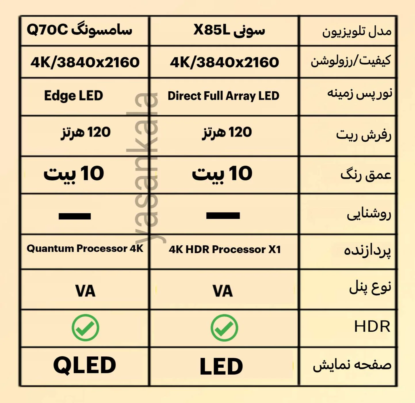 همانطور که مشاهده می کنید این تلویزیون ها از لحاظ ویژگی های تصویری تاحدودی با هم تفاوت دارند. نوع صفحه نمایش تلویزیون X85L سونی LED می باشد و نوع صفحه نمایش تلویزیون Q70C سامسونگ QLED می باشد که در این مورد تلویزیون سامسونگ می تواند تصاویری واقعی تر به نمایش می گذارد. همانطور که توی جدول اشاره شده پنل هر دو تلویزیون VA می باشد. از لحاظ نور پس زمینه متفاوت هستند زیرا تلویزیون سونی با برخورداری از بک لایت Direct Full Array LED می تواند نور پس زمینه و روشنایی را بهتر تنظیم و کنترل کند اما تلویزیون Q70C از نور پس زمینه Edge LED بهره می برد و در تنظیم روشنایی و نور به نسبت X85L ضعیف تر است.