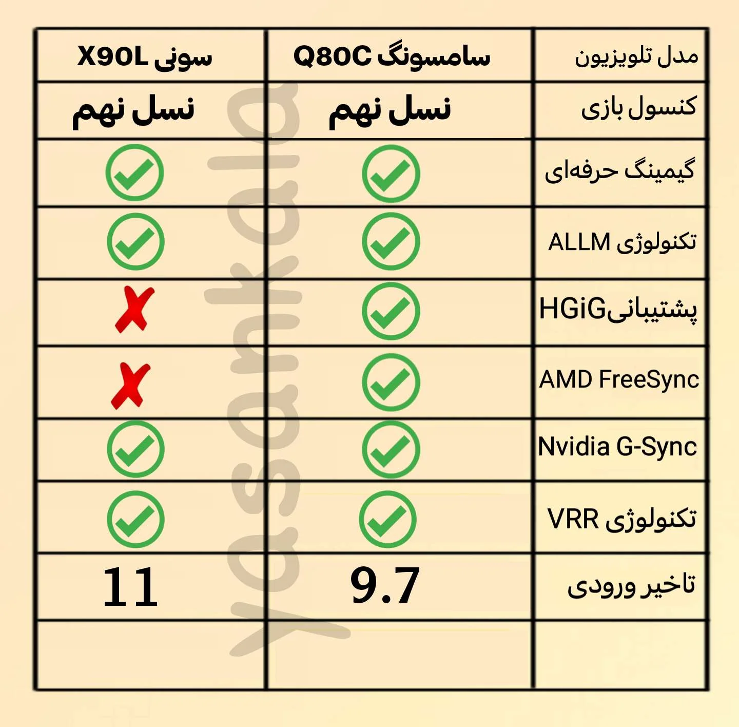 از لحاظ گیمینگ این تلویزیون ها در یک سطح می باشند و جزتلویزیون های حرفه ای برای گیمینگ محسوب می شوند. از آنجایی که هر دو تلویزیون دارای پورت HDMI 2.1 هستند و از رفرش ریت 120 هرتز برخوردار می باشند پس شما را قادر به متصل کردن کنسول های حرفه ای و نسل نهمی خواهند کرد و می توانید انواع بازی ها را با این تلویزیون ها پلی کنید. تکنولوژی Nvidia G-Sync، قابلیت ALLM و قابلیت VRR در هر دو تلویزیون پشتیبانی می شوند. اما تکنولوژی AMD FreeSync و قابلیت HGIG که تصاویر واقعی تری را به نمایش می گذارد فقط در تلویزیون سامسونگ Q80C پشتیبانی می شود. زمان پاسخگویی تصویر در تلویزیون Q80C سامسونگ برابر با 9.7 میلی ثانیه و ور تلویزیون X90L سونی برابر با 11 میلی ثانیه می باشد. به این معنی است که سامسونگ تا حدودی سریع تر بازی ها را اجرا می کند.