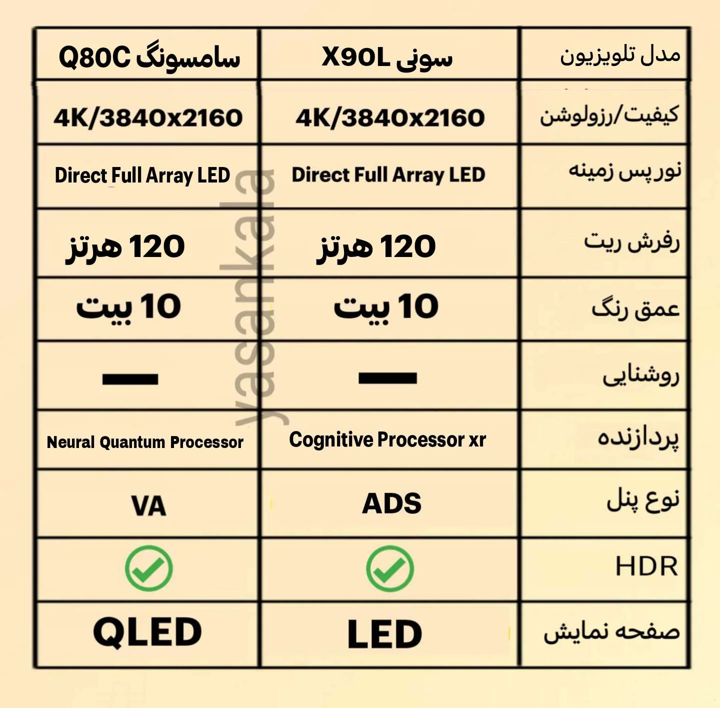 از لحاظ پردازنده تلویزیون سونی X90L با برخورداری از پردازند Cognitive Processor xr1 می تواند به بهترین شیوه به حذف نویز تصاویر و ارتقا تصاویر به 4K بپردازد و تلویزیون Q80C از پردازنده Neural Quantum Processor 4K بهره می برد که یک پردازنده قوی می باشد اما تا حدودی پردازنده سونی قدرتمند تر است. از شباهت های آنها می توان به عمق رنگ 10 بیت، کیفیت تصویر 4K و رفرش ریت 120 هرتز اشاره کرد. در حالت کلی هر دو نمایشگر از لحاظ کیفیت تصویر در یک سطح هستند اما تلویزیون سونی از لحاظ کیفیت تصویر امتیازش کمی بیشتر از سامسونگ می باشد.
