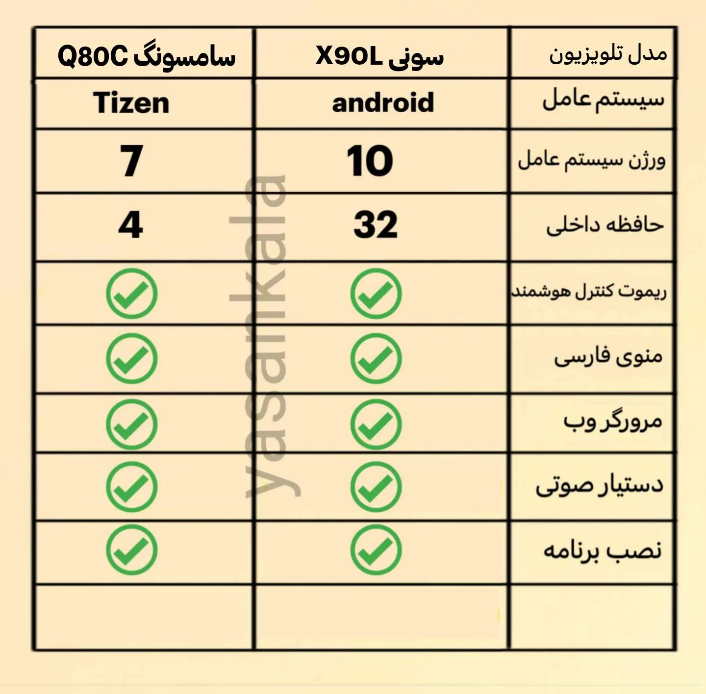 در قسمت قابلیت های هوشمند این دو تلویزیون خیلی متفاوت هستند زیرا سیستم عاملشان کاملا متفاوت است. سیستم عامل تلویزیون های سونی، اندروید می باشد و ورژنش 10 می باشد که بسیار محبوب و آسان برای استفاده می باشد. اما سیستم عامل تلویزیون های سامسونگ، Tizen و ورژنش 7 می باشد. حافظه داخلی تلویزیون سونی 32 گیگ و حافظه داخلی تلویزیون سامسونگ 4 گیگ می باشد. ریموت کنترل هر دو تلویزیون هوشمند می باشد که می توانید از دستیار های صوتی Google Assistant برای اعمال دستورات و جستجوی صوتی بهره بگیرید. تمامی قابلیت های دیگر همچون مرورگر وب، قابلیت نصب برنامه و قابلیت اتصال به موبایل در هر دو تلویزیون مشترک می باشد. البته تلویزیون سامسونگ از دستیار صوتی الکسا (Amazon Alexa) نیز بهره می برد اما تلویزیون سونی فاقد آن است. قابلیت apple home kit و کروم کست در تلویزیون سامسونگ Q80C پشتیبانی نمی شود و قابلیت انتقال صدا به موبایل و قابلیت ضبط برنامه (PVR) هم در تلویزیون X90L سونی پشتیبانی نمی شود. در حالت کلی هر دو تلویزیون دارای امکانات هوشمند و کاربردی هستند.