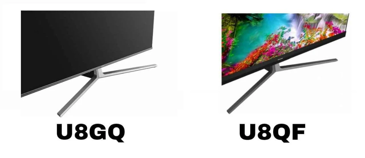 این دو مدل تلویزیون دارای پایه هایی هستند که شباهت بسیار زیادی به همدیگر دارند. پایه های تلویزیون هایسنسU8QF در وسط قرار گرفته و دارای شکل مثلثی می باشد در مقابل تلویزیون U8GQ نیز به همین شیوه دارای پایه های مثلثی می باشد که در مرکز تلویزیون قرار گرفته است. این پایه ها از استحکام فوق العاده ای برخوردار می باشند که به راحتی وزن تلویزیون ها را تحمل می کنند. پایه های هر دو مدل تلویزیون نقره ای می باشد که ظاهر هر دو مدل تلویزیون را جذاب کرده است.