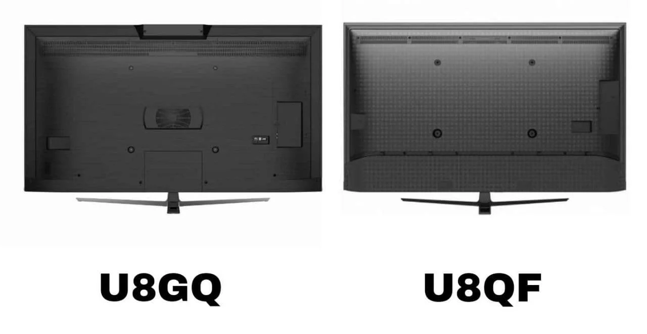 این دو مدل تلویزیون در قسمت پشتی تا حدودی با هم متفاوت می باشند. بدنه هر دو مدل تلویزیون مشکی می باشد با این تفاوت که تلویزیون U8QF دارای طراحی شطرنجی می باشد و تلویزیون هایسنس U8GQ تا حدودی ساده تر می باشد. این دو مدل تلویزیون در قسمت پشتی دارای درگاه های ارتباطی می باشند که در قسمت چپ تعبیه شده اند. همچنین در رابطه با استحکام آنها باید گفت که هر دو بسیار محکم می باشند و در ساخت انها از بهترین متریال استفاده شده است. در رابطه با ضخامت این دو مدل تلویزیون باید گفت که جز تلویزیون های ظریف محسوب نمی شوند و دارای بدنه ای تا حدودی ضخیم می باشند.