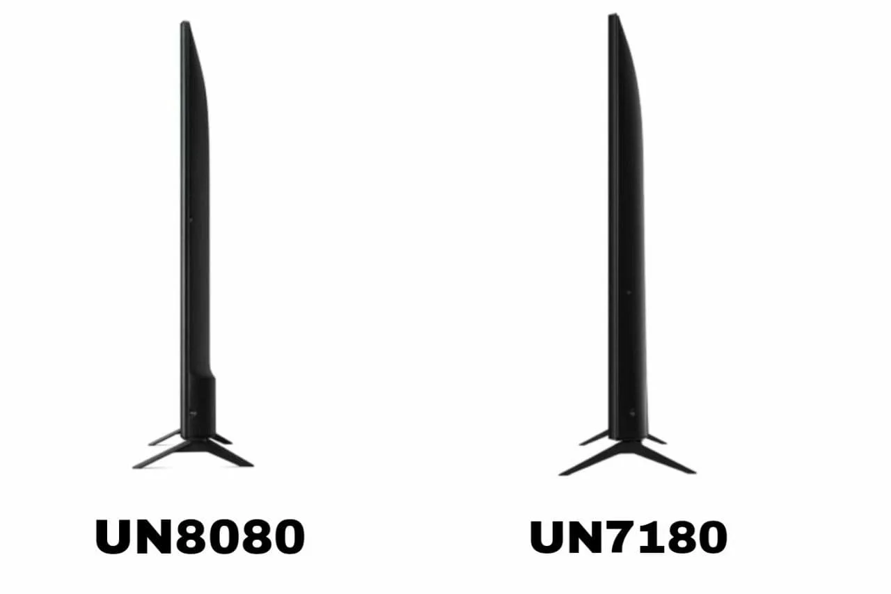 ضخامت بدنه تلویزیون ها برای بیشتر افراد از اهمیت ویژه ای برخوردار می باشد زیرا هر چه بدنه تلویزیون باریک تر باشد هنگام نصب روی دیوار جلوه ای بهتر خواهد داشت. در رابطه با ضخامت این دو مدل تلویزیون باید گفت که جز تلویزیون های باریک و ظریف محسوب نمی شوند و بدنه هر دو مدل تلویزیون از ضخامت متوسطی برخوردار می باشد. اما با این حال می توان به سادگی متوجه شد که ضخامت بدنه تلویزیون UN8080 به نسبت تلویزیون UN7180 کمتر است و تا حدوی ظریف تر می باشد