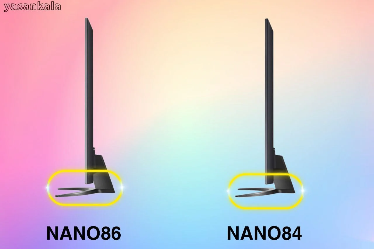همانطور که اشاره کردیم این تلویزیون ها طراحی مشابه و تقریبا یکسانی دارند. در رابطه با پایه های این تلویزیون ها نیز باید گفت که به هم دیگر شبیه می باشند. هر دو مدل تلویزیون nano84 و nano86 دارای پایه های هلالی شکلی می باشند که در مرکز تلویزیون قرار گرفته اند. این پایه های هلالی شکل از استحکام خوبی برخوردار می باشند. عرض و پهنای این تلویزیون ها چندان زیاد نیست و به سادگی روی نیز های کوچک تا متوسط هم قرار می گیرند. اگر جز افرادی هستید که علاقمند به نصب تلویزیون بر روی دیوار هستید ال جی هر دو تلویزیون را با قابلیت نصب بر روی دیوار عرضه کرده است و شما به راحتی با حذف پایه ها می توانید تلویزیون را بر روی دیوار نصب کنید. در واقع نصب تلویزیون بر روی دیوار جلوه ای مرتب تر را ایجاد خواهد کرد. بعد از پایه ها نوبت به ضخامت بدنه تلویزیون ها میرسد. ال جی این تلویزیون ها از لحاظ ضخامت بدنه هم نیز شبیه به هم طراحی کرده است و در واقع ضخامت بدنه آنها تقریبا هم اندازه می باشد. این تلویزیون ها جز تلویزیون های باریک محسوب نمی شوند و بدنه انها نسبتا ضخیم می باشد.