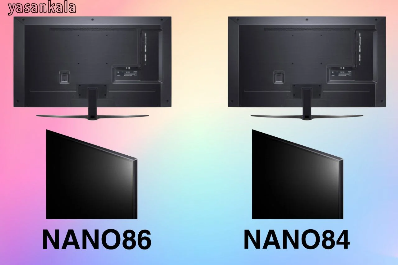این دو مدل تلویزیون ال جی در نگاه اول بسیار به همدیگر شبیه می باشند. ال جی تلویزیون ها را به صورت تخت عرضه بازار کرده است. اولین نکته حائز اهمیت در طراحی تلویزیون ها قاب آنهاست. زبان طراحی هر دو تلویزیون Cinema Screen 3 Sided می باشد. قاب هر دو تلویزیون nano86 و nano84 بسیار باریک می باشد و با رنگ مشکی طراحی کرده است. اندازه تقریبی فریم این تلویزیون ها 1 سانتی متر می باشد. این فریم باریک مشکی سبب ایجاد دید وسیع تر خواهد شد. قسمت پشتی این تلویزیون ها بسیار به همدیگر شبیه می باشند و تفاوتی در آنها دیده نمی شود. قسمت پشتی این تلویزیون ها مشکی رنگ می باشد و همچنین در سمت راست آن درگاه های ارتباطی آن ها تعبیه شده است. از لحاظ کیفیت ساخت این تلویزیون ها امتیاز بالایی کسب کرده اند و از استحکام بالایی برخوردار می باشند.
