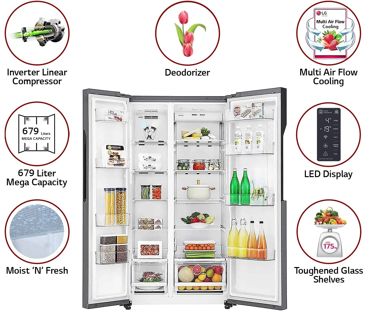 یخچال ال جی دارای امکانات متنوع و کاربردی فراوانی می باشند. از مهم ترین ویژگیهای ساید بای ساید ال جی میتوان به موتور اینورتر خطی اشاره کرد که سبب کاهش مصرف برق و انرژی و همچنین به کاهش صدای یخچال و لرزش کمک می کند. یخچال های ال جی معمولا دارای ظاهر بسیار خاصی هستند و اغلب دارای بدنه ضد لک یعنی ضد اثر انگشت و همچنین استیل هستند. انها اغلب از آبریز و یخ ریز و همچنین نمایشگر بر روی محفظه ابریر برخوردار هستند.