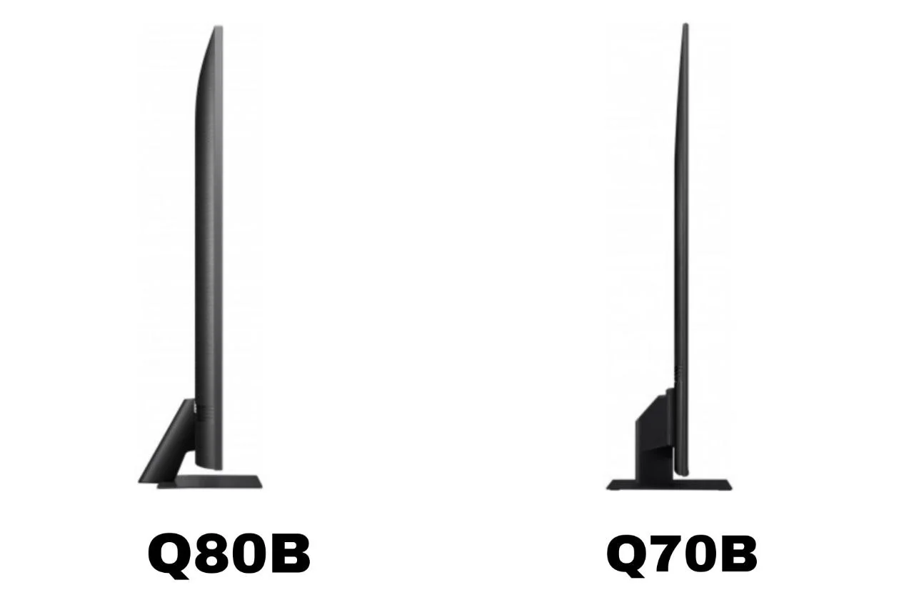 پایه ها از اهمیت ویژه ای برخوردار می باشند. این دو مدل تلویزیون سامسونگ از لحاظ طراحی پایه ها تا حدودی با هم متفاوت می باشند. در واقع هر دو مدل پایه در مرکز و وسط تلویزیون قرار می گیرند و از پهنا و عرض کمی برخوردار می باشند به عبارتی دیگر فضای کمی را خواهند گرفت. پایه اصلی تلویزیون Q80B به وسیله یک شاخه به بدنه اصلی متصل می باشد و در مقابل تلویزیون Q70B نیز پایه اصلی آن به وسیله یک شاخه به بدنه تلویزیون متصل می باشد. هر دو پایه تلویزیون ها به رنگ مشکی می باشد و از استحکام خوبی برخوردار می باشند که بدون هیچ لرزشی وزن تلویزیون را تحمل خواهند کرد. سامسونگ هر دو مدل تلویزیون را با قابلیت نصب بر روی دیوار عرضه کرده است و شما به راحتی می توانید با حذف مایه ها تلویزیون را بر روی دیوار متصل کنید. نصب تلویزیون بر روی دیوار یک گزینه بسیار پرطرفدار در بین مردم می باشد که سبب ایجاد فضای مرتب تر خواهد شد. نکته دیگر در طراحی تلویزیون که حائز اهمیت می باشد، ضخامت بدنه تلویزیون می باشد. در واقع هر دو مدل تلویزیون بدنه ای نسبتا ضخیم دارند و جز تلویزیون های ظریف محسوب نمی شوند. ضخامت بدنه این دو تلویزیون Q70B و Q80B تقریبا برابر با 5 سانتی متر می باشد و بدنه تلویزیون Q70B تا حدودی باریک تر از بدنه تلویزیون Q80B می باشد.
