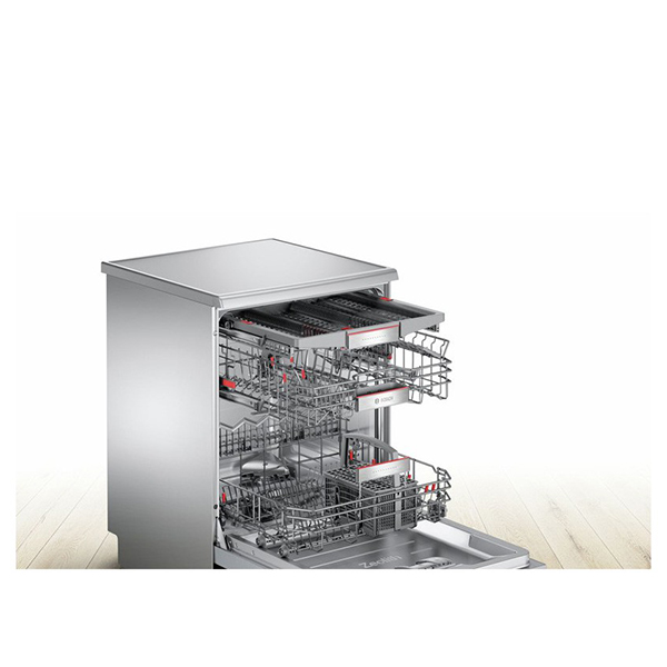 ماشین ظرفشویی بوش BOSCH مدل SMS67TI02B با رده انرژی +++A جزء ظرفشویی های ۱۴ نفره بوش بوده که توسط آن میتوان حجم زیادی از ظروف را به آسانی شستشو نمود. موتور دستگاه از نوع بی صدا بوده که علاوه بر قدرت بالا ، صدای بسیار کمی حین کار دارد ؛ ماشین ظرفشویی SMS67TI02B جزو ماشین ظرفشویی های سری 6 بوش می باشد. ماشین ظرفشویی بوش SMS67TI02B دارای ظرفیت 14 نفر است و برای خانواده هایی تا 14 نفر مناسب است. ماشین ظرفشویی 14 نفره بوش دارای 3 طبقه قابل تنظیم است و شما می توانید با توجه به ابعاد ظروف خود آنها را تنظیم نمایید. ماشین ظرفشویی بوش SMS67TI02B به رنگ سیلور بوده و با ظرفیت 14 نفر میتواند پاسخگوی نیازهای شما برای شستن ظروف در برگزای مجالس و میهمانیهایتان باشد و با داشتن 6 برنامهی شستشو و 4 برنامهی ویژهی شستشو و همچنین 4 دمای شستشو یکی از بهترین انتخابهای پیش روی شماست. ماشین ظرفشویی یکی از دستگاههای شوینده در منزل میباشد که به گروههای مبله، رومیزی و توکار تقسیم بندی میشوند که ظرفشویی مبله نسبت به دو گروه دیگر طرفداران بیشتری دارد و قادر است حجم زیادی از ظروف را شستشو دهد. ظرفشویی بوش توسط مهندسین آلمانی طراحی و تولید میشود که کیفیت بالای آن موجب شده طرفداران زیادی را در سراسر دنیا داشته باشد. ظرفشویی بوش MSM67TI02B یکی از بینظیرترین تولیدات این کمپانی آلمانی میباشد که رنگ نقرهای و بدنه استیل آن مناسب برای آشپزخانههای که با این رنگ مدرن چیدمان میشوند. این دستگاه مجهز به نشانگر تعویض نمک و مایع جلادهنده می باشد که زمانی که ظروف را درون دستگاه قرار می دهید و برنامه مورد نظر را انتخاب می کنید دستگاه روند برنامه را به شما نشان خواهد داد. ماشین ظرفشویی استیل بوش مدل SMS67TI02B دارای گزینه VarioSpeedPlus است و شستشوی سریع را در اختیار شما قرار می دهد. همچنین دارای قابلیت Half Load است و شستشوی نصف ظرفیت را فراهم می کند.