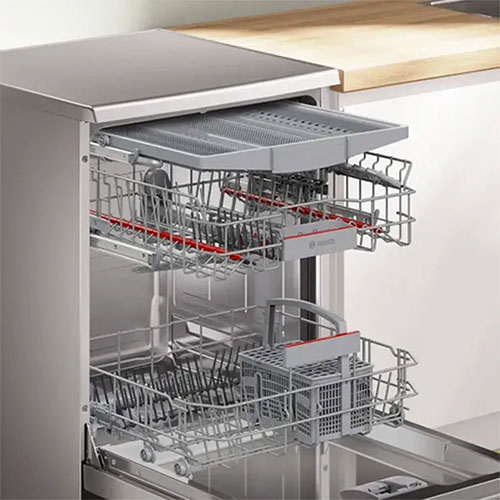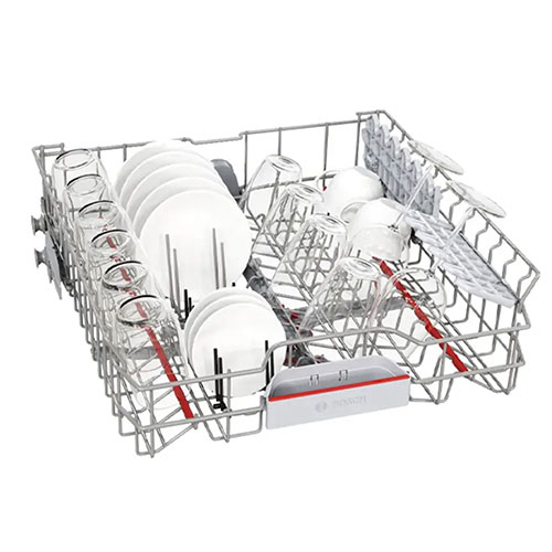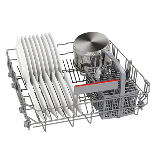 این ماشین ظرفشویی ساخت شرکت بوش سری 4 دارای ظرفیت 14 نفره است و در داخل آن سبدهایی بزرگ و جادار وجود دارند. پوشش داخلی از جنس استیل ضد زنگ دارد که همان گونه میدانید این استیل در برابر رطوبت و مواد شوینده و دمای بالا مقاومت زیادی دارد و همچنان سالم و زیبا باقی خواهد ماند. سبدهای موجود در دستگاه نیز به راحتی از داخل ظرفشویی به بیرون کشیده شده و ریل هایی با حرکت روان دارند تا برای بارگیری و تخلیه ظروف مشکلی ایجاد نشود. به خوبی میتوان ظروف 14 نفره را بر روی سبدهای آن چید و برای شستشو آماده کرد. با توجه به ظرفیت 14 نفره این ماشین ظرفشویی بوش برای استفاده یک خانواده با جمعیت متوسط به بالا عالی خواهد بود. حتی افرادی که مهمان زیادی دارند نیز میتوانند از آن استفاده کنند. بوش در این دستگاه سه سبد به کار برده که همین باعث شده است تا آن را در دسته ماشین های ظرفشویی سه طبقه قرار داد. طبقه پایین برای ظروف بزرگ نظیر قابلمه ها و ماهیتابه ها و ... کاربرد دارد. طیقه وسط یا دومی برای بشقاب ها و ظروف متوسط عالی بوده و طبقه بالایی و اولین طبقه برای قرار دادن ظروف کوچک نظیر قاشق و کارد و ... مناسب میباشد. این طبقه به صورت سینی ساخته شده است. یکی از مهم ترین ویژگی های داخل ماشین ظرفشویی بوش بهره مندی از قابلیت Rackmatic میباشد. این قابلیت یعنی داشتن امکان تنظیم ارتفاع طبقه وسط بدون نیاز به ابزار خاص و تنها با حرکتی ساده و راحت. طبقه میانی برای باز کردن جا برای چیدن ظروف بزرگ تا چند سانتی متر میتواند جا به جا شود. این حالت را میتوان دوباره به جای اول خود برگرداند. علاوه بر آن چه گفته شد در داخل این ماشین ظرفشویی بوش بازوهایی برای پاشش آب وجود دارند که به خوبی کار خود را انجام میدهد. آب را با قدرت مناسب و در جهت ها و زاویه های متفاوت بر روی ظروف چیده شده در سبدها به صورت یکسان میپاشند. با این کار روند شستشویی بهتر و سریع تر را انجام خواهند داد. هیچ نقطه ای در داخل دستگاه باقی نمیماند که در معرض آب و مواد شوینده قرار نگرفته باشد. به دلیل استفاده از فلز در پوشش داخلی علاوه بر مقاومت بالا و سالم باقی ماندنش از نظر کارایی نیز مزیت دارد و باعث میشود تا دمای ایجاد شده بهتر در داخل دستگاه باقی بماند و چربی و آلودگی های موجود بر روی ظروف را از روی آن ها پاک کند.