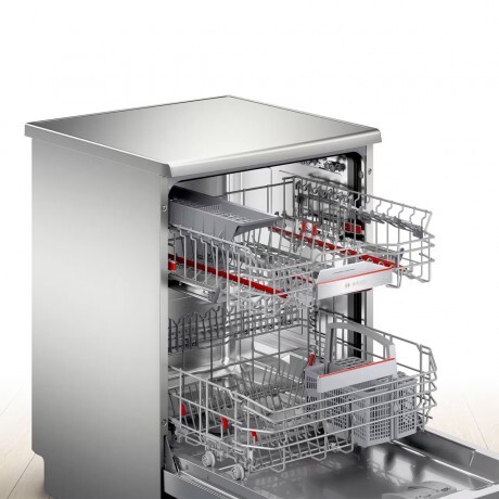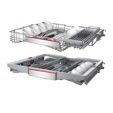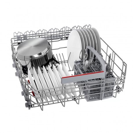یکی از قفسه ها برای ظروفی چون بشقاب، کاسه، ظرف کوچک و … تهیه شده است. قسمت دیگر مخصوص جهت قرار دادن قاشق و چنگال و لیوان ها می باشد. این قفسه ها دارای یک دسته هستند و از طریق ریل های طرفین به سمت جلو کشیده می شوند. این سبد ها در برابر زنگ و رطوبت کاملا محفوظ هستند. یک پره در بالای محصول قرار گرفته که کار پخش آب و شست وشوی ظرف ها را انجام می دهد. شرکت بوش این ظرفشویی را در ظرفیت 13 نفره طراحی و وارد بازار کرده است. پس می توان گفت حجم زیادی از ظرف ها را می توان با این وسیله شست و و داد.