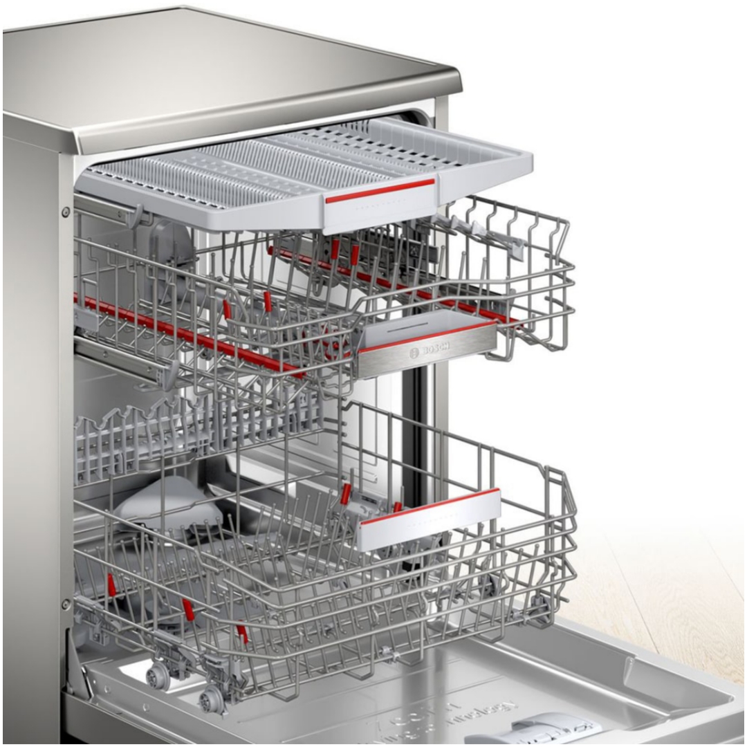 برند محبوب بوش قسمت داخلی این ظرفشویی را به بهترین شیوه و بسیار کاربر پسند طراحی کرده است. بوش آن را در سه سبد استیل طراحی کرده است. این سبد ها به قدرت جادار می باشند که می توانید انواع ظروف و وسایل را درون آنها قرار دهید. برای مثال قسمت بالایی مناسب قاشق و چنگال می باشد و می توانید تمامی کارد و چنگال را داخل ان قرار دهید. دیگر قفسه این ظرفشویی مناسب قابلمه ها، بشقاب و وسایل بزرگی می باشند که به راحتی درون ان قرار خواهند گرفت. این قفسه ها به صورت بزرگ و جاداری دیزاین شده اند که تعداد زیادی از ظروف با آن قابل شستشو می باشند. این قفسه های ظرفشویی از قابلیت تنظیم ارتفاع نیز برخوردار هستند و می توانید ظروف با اندازه بزرگ را نیز درون انها قرار دهید. این قفسه های ظرف شویی ریلی می باشند که سبب می شود حرکت قفسه ها بسیار راحت تر باشد.