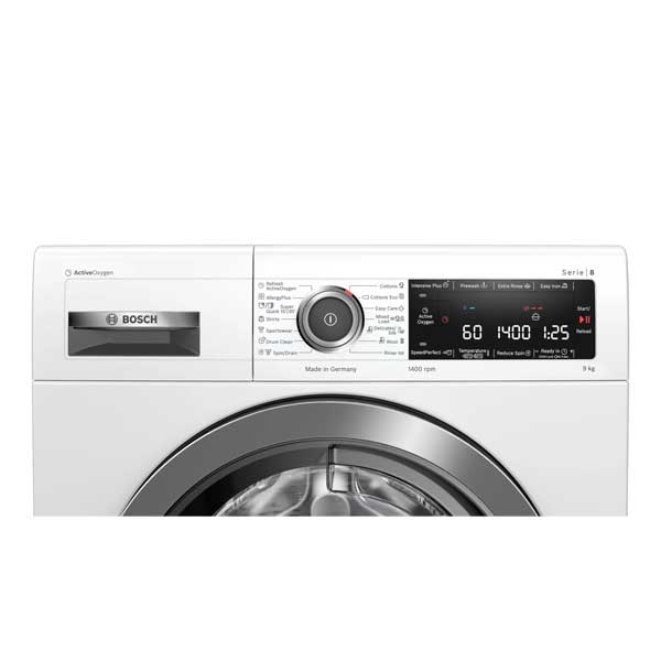 فناوری ActiveOxygen™ حتی ظریف ترین لباس ها را از شر 99.9 درصد باکتری ها و میکروب ها با دمای پایین شستشو خلاص می کند. بدون افزودنی های شیمیایی و تنها با یک فشار یک دکمه. ActiveOxygen™ تمیز کردن بهداشتی را برای محافظت از پارچه های شما به خطر نمی اندازد. فرآیند شستشو به گونه ای بهینه شده است که رنگ لباس های ظریف حفظ می شود و از چروک شدن لباس های شما جلوگیری می شود. به همین دلیل است که لباس مورد علاقه شما برای مدت طولانی تری لباس مورد علاقه شما باقی می ماند. فناوری ActiveOxygen بوش از اکسیژن فعال برای حذف تا 99.99 درصد باکتری ها ، حتی در دماهای پایین، بدون افزودن مواد شیمیایی خاص استفاده می کند. این عملکرد با اکثر برنامه های شستشو سازگار است ، بنابراین حتی پارچه های ظریف نیز کاملا تمیز خواهند بود و رنگ خود را حفظ می کنند. ماشین لباسشویی بوش 9 کیلو سری 8 مدل WAV28L90 برنامه تازه سازی ActiveOxygen لباس هایی را که به خودی خود تمیز هستند اما بوی بدی تازه ای نمی دهند تنها در عرض 45 دقیقه تازه می کند. ماشین لباسشویی بوش مدل WAV28L90ME آلمان لباس ها را با آب سرد می شوید و تا سطح 99.9 درصد کثیفی، باکتری و دیگر میکروب ها را از بین می برد. این برنامه برای ظریف ترین لباس ها حتی برای پارچه های غیر قابل شستشو بدون آسیب رساندن به آنها مناسب است. برنامه ActiveOxygen refresh ضمن محافظت از پارچه های شما در زمان شما صرفه جویی می کند. کمد لباس خود را به نظافتی با کیفیت حرفه ای تبدیل کنید.