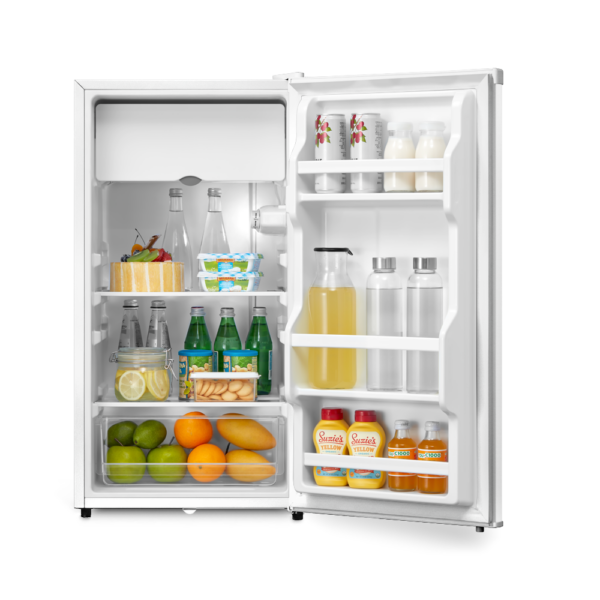 این یخچال تنها از یک درب تهیه شده که به سمت راست باز و بسته می شود. بر روی درب هیچ نشانی از آبریز، صفحه نمایش یا پنل وجود ندارد. به نوعی می توان گفت با ساده ترین حالت ممکن تهیه شده است. اما کیفیت کار آن بدون شک رضایت مصرف کننده را به دنبال دارد. یخچال ایوولی EVRFM-90LW نمای داخلی مناسب و منظمی هم دارد. بر روی درب و در قسمت داخلی 3 قفسه جا دار وجود داشته که برای قرار دادن بطری، شیشه و … مناسب است. بخش یخچال نیز شامل 1 عدد کشو و 2 طبقه ی نسبتا بزرگ می باشد. فریز این وسیله درون یخچال و در قسمت بالایی وجود دارد. فریز به وسیله ی یک درپوش پلاستیکی سفید پوشانده شده است. زمانی که درپوش را باز می کنید 2 طبقه ی کوچک قابل مشاهده خواهد بود. جنس طبقه و قفسه های داخلی مطلوب و اصلی هستند که از مقاومت بالایی برخوردار می باشند.