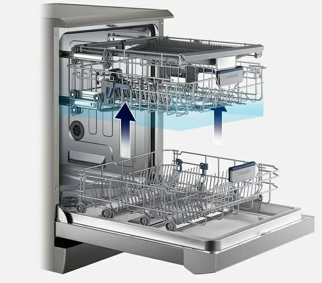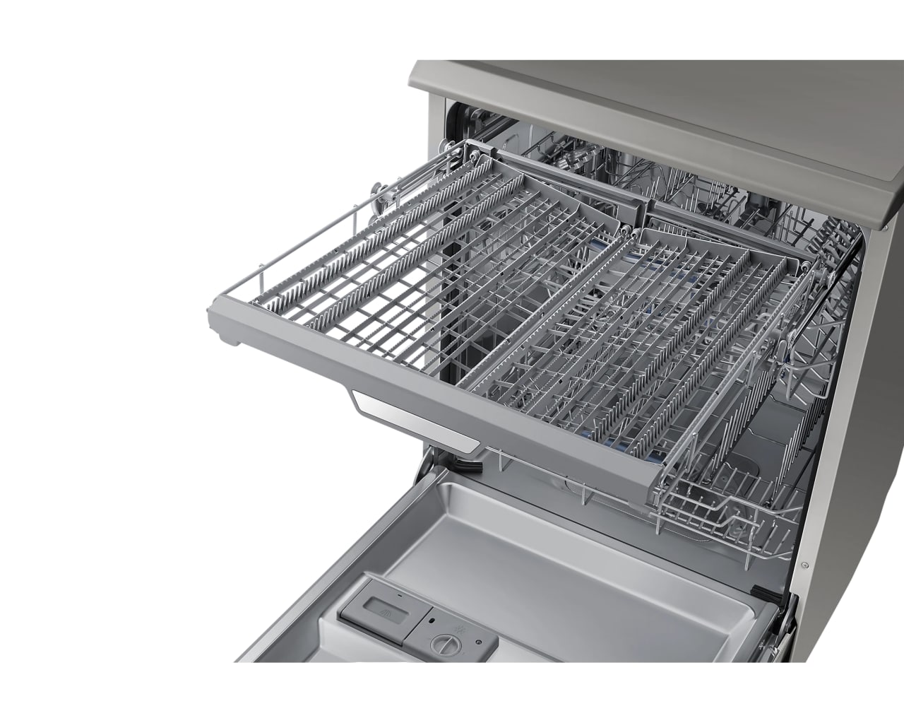 این ظرفشویی دارای طراحی داخلی بسیار کاربر پسندی می باشد. سامسونگ آن را در سه سبد استیل طراحی کرده است. این سبد ها ها برای انواع ظروف و وسایل تعبیه شده اند. برای مثال ظروف بالایی مناسب قاشق و چنگال می باشد و می توانید ظروفی همچون کارد و چنگال را داخل ان قرار دهید. دیگر قفسه این ظرفشویی مناسب قابلمه ها، بشقاب و وسایل بزرگی می باشند که به راحتی درون ان قرار خواهند گرفت. این قفسه ها دارای ابعاد بزرگی می باشند و می توانید درون آن تمامی وسایل را برای شستشو قرار دهید. این قفسه ها ظرفشویی از قابلیت تنظیم ارتفاع نیز برخوردار هستند و می توانید ظروف با اندازه بزرگ را نیز درون انها قرار دهید. این قفسه های ظرف شویی ریلی می باشند و به راحتی حرکت خواهند کرد.