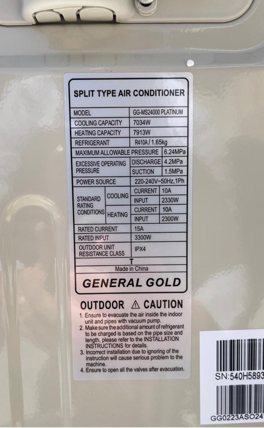 مدل و سری: این کولر گازی با مدل دقیق GG-MS24000 Platinum و از سری Platinum تولید شده است که نشان میدهد یک مدل رده بالا در بین محصولات جنرال گلد است.