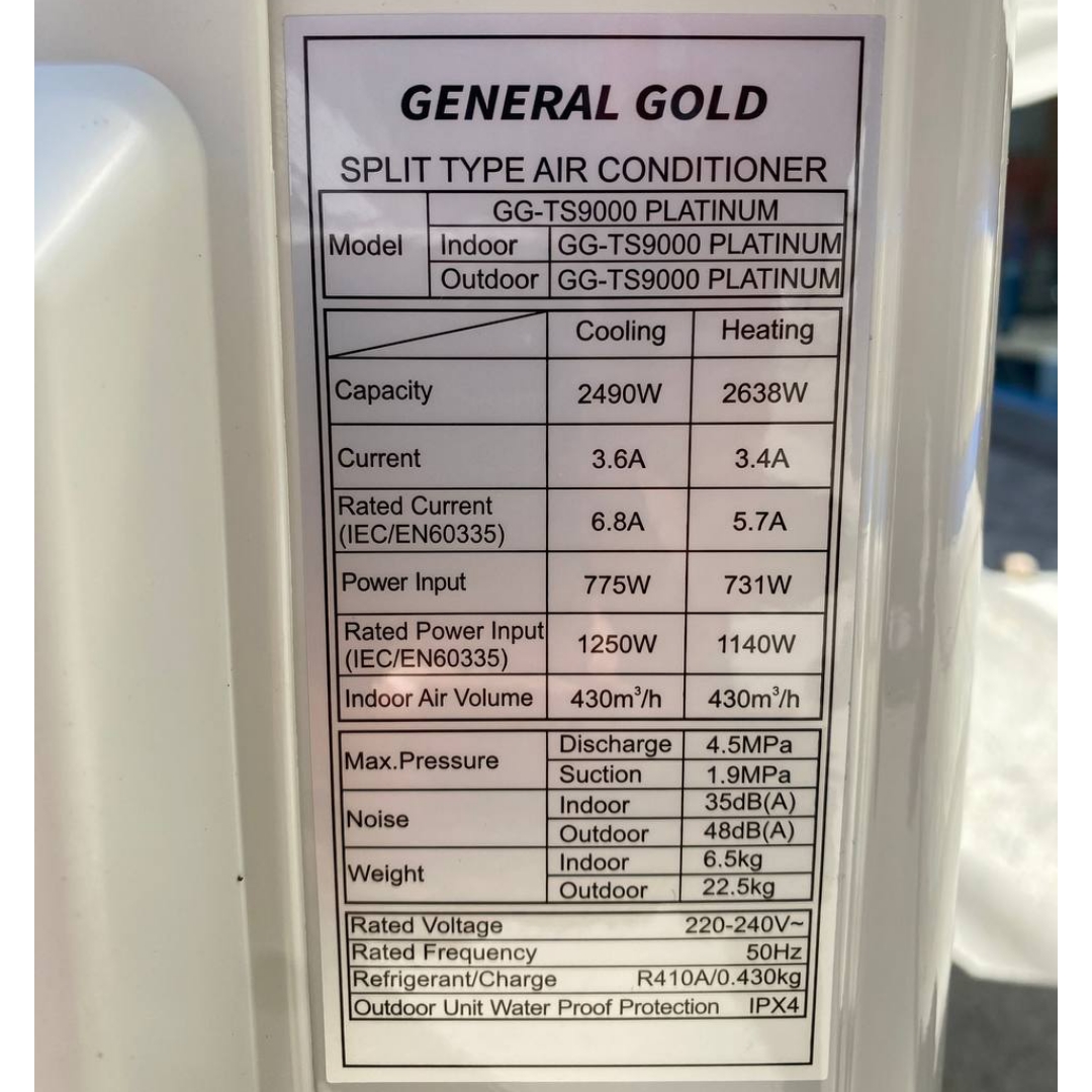 این کولرگازی جنرال گلد 9000 یک محصول بی نظیر می باشد. از نظر طراحی می توان گفت که بسیار ساده طراحی شده است. این کولرگازی جنرال گلد دارای رنگ سفید می باشد. این رنگ سفید سبب ایجاد نمای بسیار مدرن شیک در خانه خواهد شد و به سادگی با هر دکوری هماهنگ می شود. این پنل سفید رنگ دارای حالت نسبتا خمیده می باشد و لبه های ان چندان تیز و مستطیلی نمی باشد. جنس بدنه این پنل از پلاستیک می باشد که بسیار محکم است و در برابر هر خط و خشی مقاوم می باشد. در قسمت چپ کولر گازی شما شاهد یک led مخفی می باشید که در هنگام استفاده از ریموت کنترل می توانید دمای کولر و یا دیگر اطلاعات را مشاهده کنید. این کولر گازی دارای دو یونیت می باشد یکی آنکه بر روی دیوار متصل می شود و دومی در بیرون قرار گرفته می شود. پنل بیرونی این کولر گازی از استحکام زیادی برخوردار می باشد و در برابر باد، باران، نور خورشید حتی تگرگ نیز مقاوم است. این دو یونیت از طریق یک لوله به همدیگر متصل خواهند شد. این کولر گازی دارای یک ریموت کنترل نیز می باشد که از طریق ان می توانید به تنظیم کولر گازی از فاصله چند متری بپردازید.