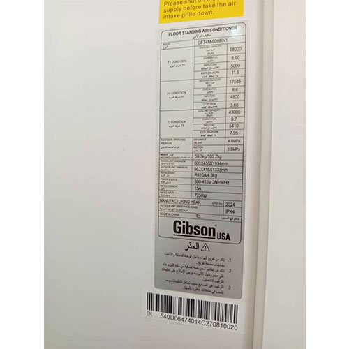 کولر گازی ایستاده 60000 گیبسون مدل GFT4M-60HRN1 قدرت سرمایش فوق العاده ای دارد معادل ۵ تن سرمایشی و گرمایشی است و با توجه به ظرفیت بالا و ۶۰۰۰۰ این کولر گازی برای فضاهای سر پوشیده و بزرگ طراحی شده و کاربرد دارد. از این رو اگر برای مکان های بزرگ به دنبال یک کولر گازی با کیفیت و با کارایی عالی هستید که به خوبی محیط های بزرگ را در زمان مناسب به دمای مطلوب برساند پیشنهاد ما به شما خرید کولر گازی ایستاده گیبسون ۶۰۰۰۰ است. علاوه بر قابلیت سرمایش به عملکرد گرمایش نیز مجهز است. این کولر گازی گیبسون از نوع ایستاده میباشد و یونیت داخلی و یونیت خارجی دو موتوره دارد. کمپرسور موجود در این کولر گازی گیبسون از نوع روتاری T3 است که در دمای بالا نیز کارایی فوق العاده ای دارد. از این رو برای استفاده در مناطق گرمسیری با تابستات داغ و سوزان عالی بوده و بهترین کارایی را دارا میباشد. هوایی مطبوع را تولید میکند و در مقابل مصرف برق کمی دارد.