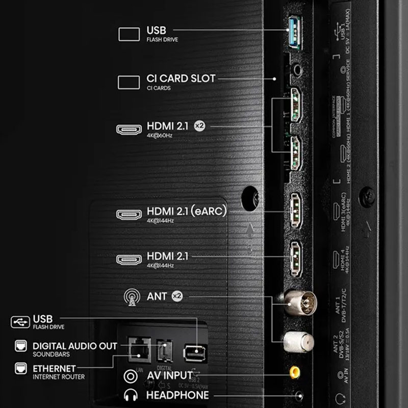 پورت های ارتباطی کاربردی و غنی در این نمایشگر به شیوه عالی ارائه شده است. این تلویزیون دارای 4 پورت HDMI است که برای گیمرهای حرفهای گزینه مناسبی می باشد و نیاز گیمرها را برطرف کرده است. همچنین دارای 2 پورت USB است که برای اتصال به هارد، مموری و فلش مورد استفاد قرار میگیرد و میتوان گفت از عمومیترین نقل و انتقالها در بین مردم به شمار میآید. دیگر ورودی ها وای فای (Wi-Fi) و بلوتوث (Bluetooth ) را داریم که از راحت ترین و آسانترین مدل ارتباطی به حساب میآید و می توانید از امکانات آنلاین تلویزیون بهرهمند شوید. در نهایت میتوان به LAN، پورت اپتیکال (Optical) وRF اشاره کرد که هر کدام در جایگاه خود از درجه اهمیت بالایی برخوردار هستند.