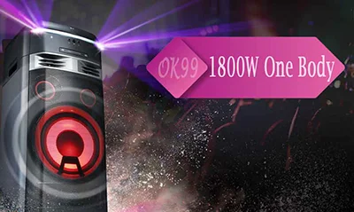سیستم صوتی ال جی 1800 وات ایکس بوم مدل XBOOM OK99 یکی از محصولات پرطرفدار و منحصر به فرد برند ال جی می باشد ؛ این محصول با عرصه ی خود به بازار جهانی توانسته نظر کاربران زیادی را به خود جلب نماید. این سیستم صوتی در حال حاظر یکی از بهترین و عالی ترین سیستم صوتی های موجود در بازار می باشد. همان طور که می دانید سیستم صوتی می تواند یک گزینه مناسب برای افزایش صدا باشد که اغلب می توانید در مکان های عمومی ، باشگاه ها یا جشن های بزرگ از آن استفاده نمایید. این محصول علاوه بر کارایی های فوق العاده خود دارای طراحی بسیار شیکی می باشد که می تواند محیطی دلربا و زیبا را برای شما به ارمغان آورد. مجموع توان تعریف شده برای این محصول برابر 1800 وات می باشد. فناوری کارائوکه همراه با میکروفون حس خوانندگی را به کاربر القا می کند. یکی دیگر از قابلیت های عالی این دستگاه قابلیت بلوتوث می باشد که با استفاده از آن می توانید تمامی آهنگ های مورد علاقه خود را پخش نمایید و با استفاده از بلوتوث می توانید سه دستگاه متفاوت را به این سیستم صوتی وصل نمایید. با وجود پورت های USB نیز می توانید دستگاه های USB خود را وصل کنید و محتوای فایل هایتان را به شیک ال جی انتقال دهید. علاوه بر این از طریق USB می توانید آهنگ های مورد علاقه یتان را ضبط کنید.