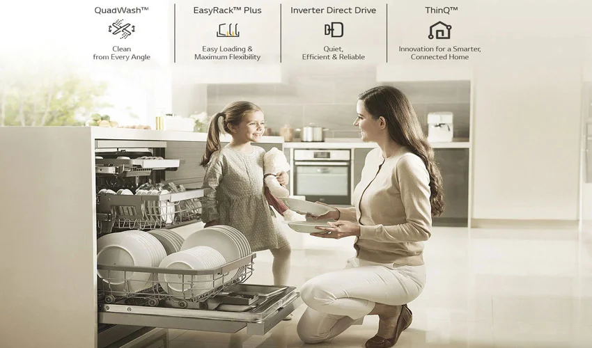 با برنامه LG ThinQ می توانید تعداد برنامه های شستشو را بر اساس نیاز خود افزایش دهید ، به عنوان مثال با برنامه شستشو در شب یا برنامه شستشوی شیشه. برنامه هوشمند همچنین به شما هشدار می دهد که باید برنامه تمیز کردن ماشین ظرفشویی را بعد از 30 دوره شستشو اجرا کنید. به لطف فناوری SmartThinQ به راحتی می توانید ماشین ظرفشویی هوشمند خود را در هر زمان و هر مکان از راه دور کنترل کنید . از طریق اتصال Wi-Fi ، تعامل با ماشین ظرفشویی کاملاً آسان است و امکان دسترسی به آخرین نوآوری ها را فراهم می کند. ماشین ظرفشویی ال جی مدل DFB325HM با بهره گیری از فناوری هوشمند SmartThinQ ، ظرفشویی را تبدیل به یک ربات هوشمند می کند که قابلیت اتصال به گوشی های هوشمند را فراهم می کند. این ظرفشویی توسط وای فای و NFC امکانات متعددی ارائه می کند.