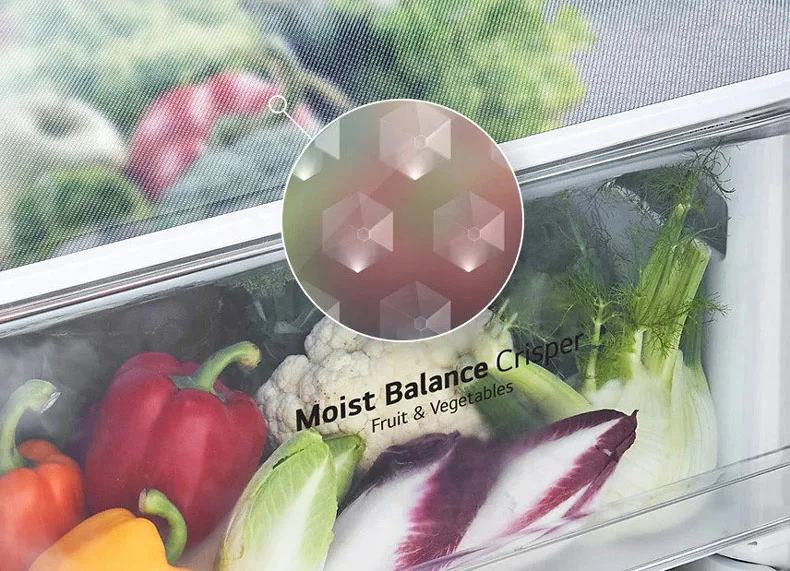 یخچال ال جی 411 و 414 با سیستم Moist Balance Crisper سطح رطوبت را برای بهینه سازی حفظ غذا تنظیم می کند. محفظه Moist Balance Crisper دارای یک قفسه Magic Crisper در قسمت فوقانی است که دارای ساختار لانه زنبوری است. بر خلاف یک محفظه معمولی که در آن رطوبت می تواند گودال هایی را در اطراف غذا ایجاد کند ، رطوبت موجود روی غذا در سینی در سلول ها ذخیره می شود. سپس به تدریج در محفظه توزیع می شود تا سطح رطوبت مطلوب را حفظ کند. به گفته ال جی ، این سیستم رطوبت هوا را تا 20 درصد بیشتر از یک محفظه معمولی حفظ می کند. یخچال دو قلو ال جی 40 فوت Mois Balance Crisper این پوشش جعبه ای از نوع مشبک است که رطوبت را در سطح اپتینوم حفظ می کند. رطوبت مواد غذایی ذخیره شده تبخیر شده و سپس روی شبکه متراکم می شود و تعادل صحیح رطوبت در جعبه حفظ می شود.
