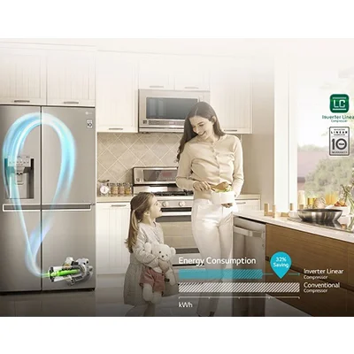 پس انداز انرژی با کمپرسور خطی اینورتر در این یخچال 34 فوت ال جی بسیار آسان و انجام پذیر است که دارای رده انرژی A است و در مصرف انرژی صرفه جویی می کند. و اما این کمپرسور خطی اینورتر منحصر به فرد ال جی به جای درایو رفت و برگشت معمولی از یک درایو پیستونی خطی استفاده می کند. این اصطکاک داخلی کمتری ایجاد می کند و در نتیجه 32٪ انرژی کمتری مصرف می شود. این کمپرسور بسیار قدرتمند است که خنک کنندگی سریعی برای یخچال دارد و نیز در کمترین زمان فریزر را به نقطه ی انجماد می رساند.
