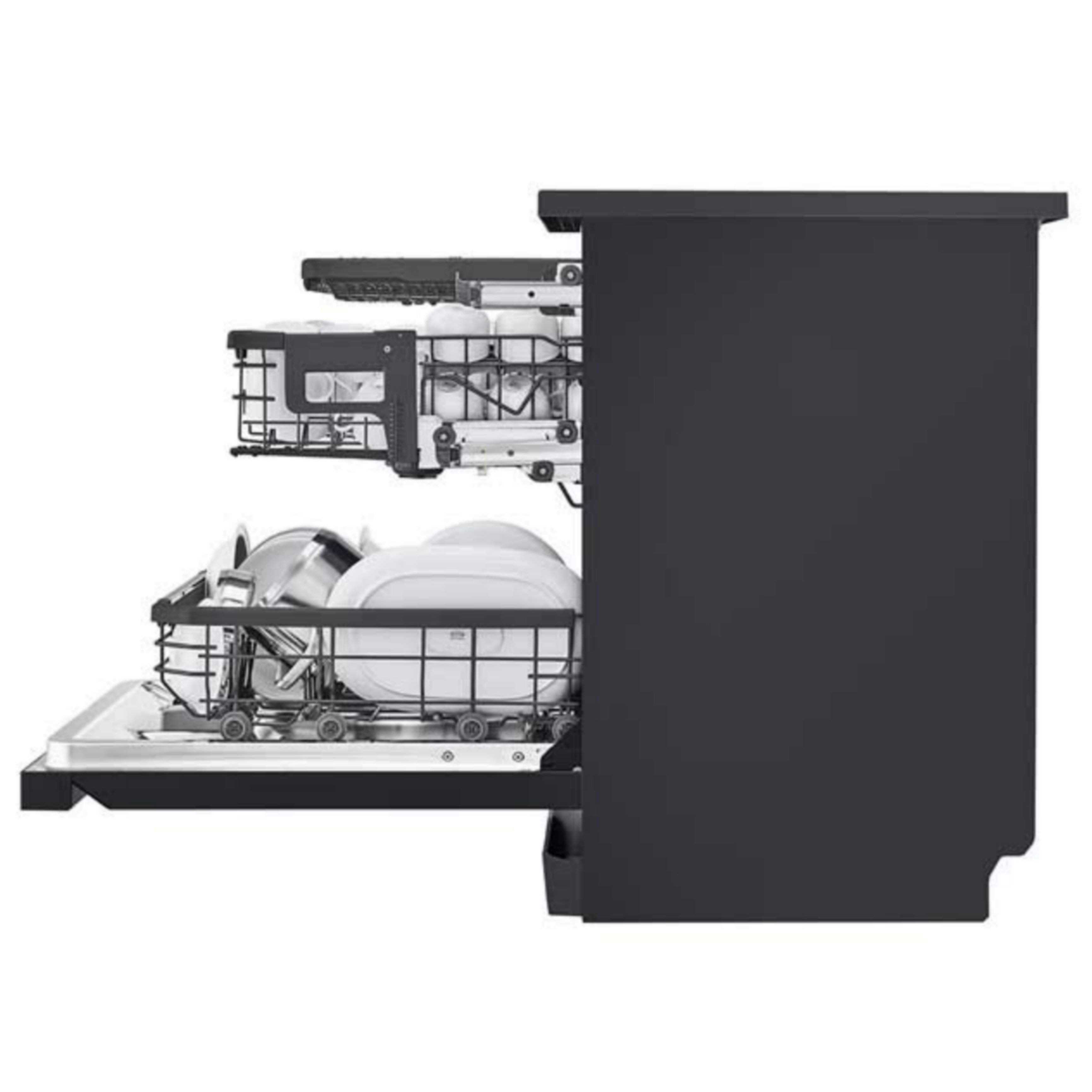 ال جی قسمت داخلی این ظرفشویی را بزرگ و جادار طراحی کرده است که متشکل از سه سبد استیل می باشد. این سبد ها بزرگ می باشند و می توانید انواع ظروف و وسایل را درون آن قرار دهید زیرا این قفسه ها قابلیت تغییر ارتفاع را دارند و به دلخواه می توانید ظروف را بر حسب اندازه جای گذاری کنید. یکی از قفسه ها مخصوص قاشق و چنگال می باشد و می توانید ظروفی همچون کارد و چنگال را داخل ان قرار دهید و دیگر قفسه های این ظرفشویی را به وسایل بزرگتر همچون قابلمه ها، بشقاب و وسایل بزرگی اختصاص داده است. همچنین این سبد ها ریلی می باشند و به راحتی حرکت خواهند کرد. قسمت داخلی این ظرفشویی از استیل خیلی با کیفیت و ضد زنگ می باشد. این ظرفشویی با برخورداری از جت واش اضافی می تواند آبکشی بسیار دقیق تری را ارائه دهد.