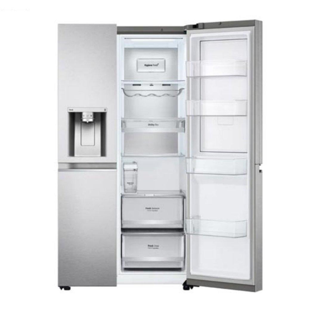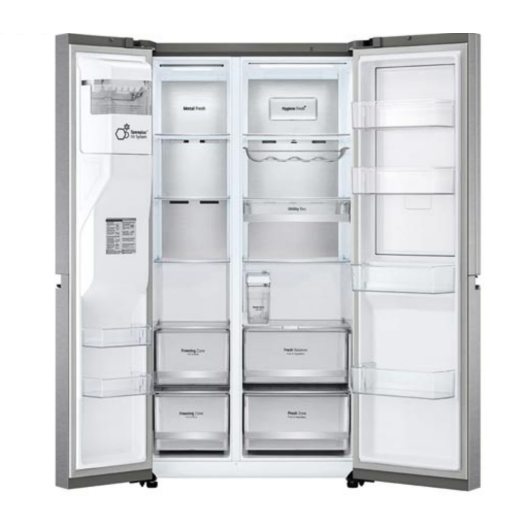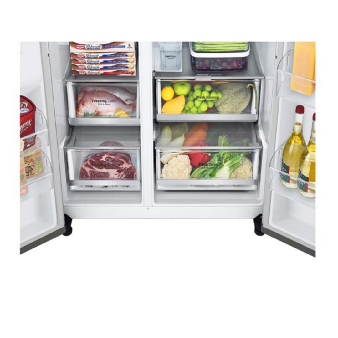 این یخچال ساید بای ساید ال جی دارای ظرفیت 30 فوت می باشد که این ظرفیت 30 فوت برابر با 617 لیتر می باشد که از این میزان 412 لیتر متعلق به یخچال و 205 لیتر متعلق به فریزر می باشد. اگر خانواده ای 4 یا 5 نفره هستید و مصرف مواد غذایی بالایی دارید، این یخچال با این ظرفییت 617 لیتر گزینه ای بسیار مناسب می باشد. این دستگاه در قسمت یخچال دارای 4 طبقه، 2کشو و در قسمت درب دارای 4 قفسه می باشد. در قسمت فریزر دارای 4 طبقه، 2 کشو و 4 قفسه در درب آن می باشد. قفسه های این یخچال دارای اندازه ای بزرگ می باشند و قادر به جای دادن مقدار زیادی مواد غذایی درون خود می باشند. جنس این قفسه ها از شیشه حرارت دیده می باشد که فوق العاده محکم می باشند و می توانید مواد غذایی با هر حجم و وزنی را روی ان قرار دهید. ال جی درون این یخچال یک قفسه ریلی شکل تعبیه کرده است که به شما این امکان را خواهد داد تا بطری ها را به صورت خوابید روی ان قرار دهید. همچنین به لطفکشو Utility Box می توانید تکه های کیک یا میوه و حتی کره و مواد غذایی ریز و کوچک را داخل آن قرار دهید.