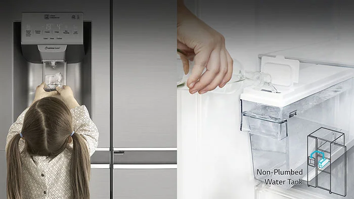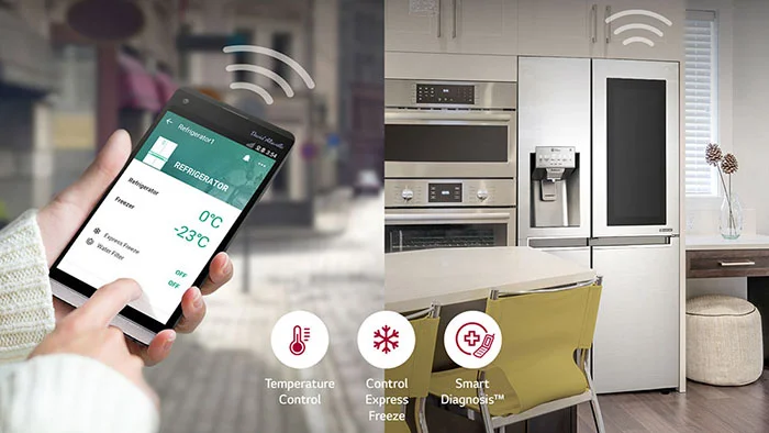 با قابلیت LG ThinQ می توانید یخچال خود را توسط تلفن هوشمند خود کنترل و تشخیص دهید حتی زمانی که در خانه نیستید. به راحتی دمای یخچال را تنظیم کنید، Express Freeze را کنترل کنید و یخچال خود را با لمس ساده بر روی تلفن هوشمند خود تشخیص دهید. دیگر حتی از راه دور و هنگامی که در خانه نیستید نیز می توانید دمای یخچال را کاهش دهید آنرا زیاد کنید و یا قابلیت های یخچال را خاموش و یا روشن کنید.