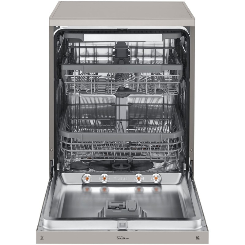 این درب از طریق دستگیره ی مربوطه به سمت پایین باز می شود. محفظه ی مخصوص مواد شوینده در قسمت داخلی ظرفشویی قرار دارد. در قسمت بالایی بدنه صفحه نمایش دیجیتالی مشاهده می شود. این صفحه تمامی کارایی و نوع عملکرد ظرفشویی را به نمایش می گذارد. اینگونه می توان از طریقه ی کاری محصول خود آگاهی داشت. پنل تنظیمات و برنامه های شست و شو توسط دکمه و با نوشته های مربوطه در همان قسمت از بدنه وجود دارد. اندازه و وزن ظرفشویی 325 ال جی بسیار استاندارد و مناسب می باشد.