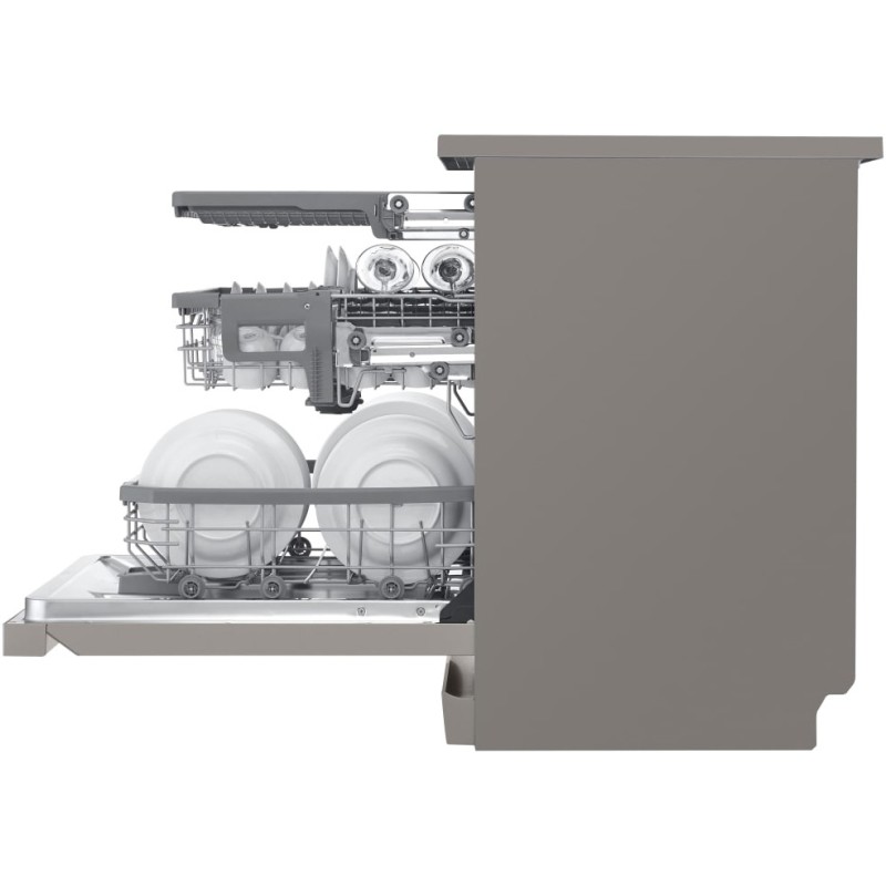 ظرف ها داخل بدنه ی ظرفشویی قرار می گیرند به همین دلیل طراحی داخلی جزو ارزش های مهم می باشد. کاربران حتما به نوع قرار گیری قفسه ها و نمای داخلی توجه نشان می دهند. ماشین ظرفشویی ال جی 325 رنگ نقره ای از ظرفیت 14 نفره بهره برده است. با این ظرفیت می توانید حجم زیادی از ظرف ها تنها با یک بارگیری تمیز کنید. ال حی قفسه ها را بسیار مرتب و بر اساس استانداردهای لازمه تعیین کرده است. این طرفشویی در قسمت داخلی خود 3 عدد قفسه دارد. قفسه ی اول را می توانید برای قرار دادن قاشق، چنگال، کارد و … استفاده کنید. برای جای دادن بشقاب، کاسه، لیوان و … هم می توانید به قفسه ی دوم مراجعه کنید. با این محصول می توانید ظرف های بزرگ مانند قابلمه و تابه هم شست و شو دهید.