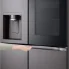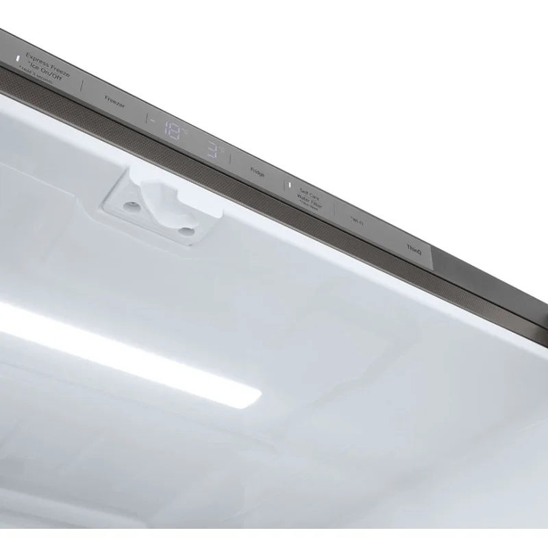 این یخچال در واقع متشکل از 4 درب می باشد که 2 درب بالا متعلق به یخچال و 2 درب پایین متعلق به فریزر می باشد. اما از آنجایی که دارای درب اینستا ویو نیز میباشد توان گفت که از 5 درب برخوردار میباشد. ال جی دستگیره ها را در این یخچال به صورت مخفی Square Pocket Handle طراحی و دیزاین کرده است و اصلاً دستگیره یخچال برجسته نیست تنها به وسیله فشار یک اهرم کوچک در گوشه درب می توانید آن را میتوانید باز و بسته کنید. امروزه دستگیرههای مخفی بسیار پرطرفدار هستند و بر خاص بودن و جذابیت یخچال میافزایند. بر روی درب سمت چپ یخچال شاهد یک محفظه خواهیم بود. در واقع این محفظه آبریز و یخ ریز می باشد که به راحتی میتوانید به آب سالم تصفیه شده و قطعه های یخ دسترسی پیدا کنید. این اب ریز و یخ ریز در سه وضعیت قابل تنظیم هستش که می توان به یخ خرد شده، اب ریز و یخ مکعبی دسترسی داشته باشید. محفظه آبریز و یخریز یخچال ساده میباشد و بر روی آن خبری از پنل لمسی نیست. پنل لمسی در این یخچال ال جی مدل 2024 به قسمت دیواره بالایی یخچال انتقال داده شده است و شما میتوانید تنظیمات یخچال را از طریق این پنل تغییر دهید.