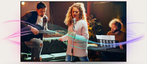 سیستم صوتی که ال جی برای تلویزیون بزرگ خود قرار داده قدرت خوبی دارد. از نوع سیستم صوتی 2.2 کاناله بوده و توان صوتی 40 وات دارا میباشد. در واقع صدای این تلویزیون ال جی تنها بلند نیست بلکه به صورت فراگیر، واقع گرایانه و بدون نویز است. برای بهبود صدای این دستگاه فناوریهای جدید و فوق العاده زیادی به کار گرفته شده اند. برخی از مهم ترین آن ها شامل موارد زیر هستند: