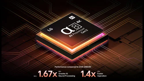 تلویزیون ال جی کیوند 100 اینچ QNED86A مجهز به پردازنده هوشمند از نوع آلفا 8 نسل 2 است. این پردازنده باعث تنظیم شدن کیفیت تصویر به صورت فریم به فریم و پویا میشود. در نتیجه تصویری با کیفیت بر روی نمایشگر تلویزیون ظاهر خواهد شد. هر تصویر قبل از ایجاد شدن بر روی نمایشگر دستگاه به دقت و با سرعت مورد تجزیه و تحلیل قرار میگیرد. این پردازشگر آلفا تنها برای بخش تصویر نیست بلکه صدای تلویزیون را نیز مورد تجزیه و تحلیل دقیق خود قرار میدهد. ال جی آن را مغز متفکر تصویر و صدای تلویزیون خود معرفی کرده است. هر تصویر به صورت فریم به فریم تحلیل میشود. نتیجه وجود آن بهترین حالت رنگ، وضوح و کنتراست بالاست. پردازنده آلفا 8 نسل 2 دارای فناوری های عالی زیادی بوده که یکی از آن ها Al Picture Pro است. این تکنولوژی کارش شناسایی اشیاء، چهره ها و پس زمینه موجود در تصاویر میباشد و کمک زیادی در تولید تصاویر پویا و واقع گرایانه میشود. علاوه بر این ویژگی پردازنده موجود در تلویزیون هوشمند ال جی دارای قابلیت Al Sound Pro است. در بخش صدا نیز نقش فوق العاده ای داشته و سبب ایجاد صدایی فراگیر میشود.