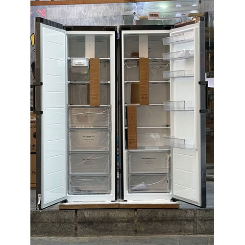 در این بخش میخواهیم به فضای داخلی که هر کدام از بخش های یخچال و فریزر دارد بپردازیم. همان گونه که میدانید ظرفیت این دستگاه 40 فوت است و به لیتر 708 لیتر میباشد. هر بخش از آن توسط دربی بزرگ پوشش داده شده و با باز کردن درب فضای داخلی آن ها قابل مشاهده و دسترسی خواهد بود. در بخش یخچال که ظرفیت 385 لیتر دارد طبقات و کشوهایی وجود دارند مجهز به 5 طبقه و 2 کشو برای نگه داری از میوه و سبزیجات با قابلیت حفظ رطوبت (Moist Balance Crisper) است. طبقات از جنس شیشه حرارت دیده هستند و قابلیت تحمل وزن زیاد و دمای پایین را دارند و به سادگی نمیشکنند و ترک برنخواهند داشت. شفاف بودن از دیگر خصوصیات شیشه به کار رفته در طبقات و کشوها میباشد. همچنین بر روی درب یخچال در داخل شاهد نصب بودن تعدادی طبقه هستیم و دارای 5 قفسه بر روی درب یخچال است. در طرف دیگر این دستگاه یعنی بخش فریزر که گنجایش 324 لیتر دارد نیز تعدادی طبقه و کشو وجود دارند. دارای 3 طبقه و 4 کشو میباشد. درب آن بدون قفسه است. مجهز به کشو Big Freezing Zone بوده و دمای آن از دیگر بخش های فریزر پایین تر است تا مواد حساس تر را بهتر به صورت فریز شده نگه داری کند.