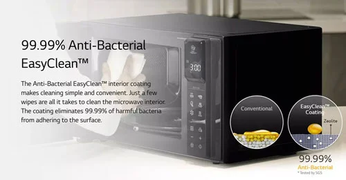 در بالا به عبارت ایزی کلین اشاره کردیم. در واقع این قابلیت در بخش داخلی و بدنه داخلی مایکروویو ال جی به کار رفته است. پوشش داخلی بدنه دستگاه از نوع اختصاصی easyclean میباشد و پاکسازی آسان بدون استفاده از مواد شوینده و مواد شیمیایی نتیجه وجود آن است. این پوشش به گونه ای بوده که لکه ها، چربی ها و باقی مانده مواد غذایی به آن نخواهد چسبید. در نتیجه در پایان کار پخت و پز با مایکروفر ال حی با یک دستمالکشی ساده به راحتی تمیز میشود. البته لازم است تا دستمال کمی مرطوب باشد. تمامی قسمت های داخلی مایکروویو به راحتی تمیز میشود بدون آن که لازم باشد تا از مواد شوینده و مواد شیمیایی برای آن استفاده کنید. این مواد در اثر استفاده زیاد آسیب زا هستند و به بدنه دستگاه آسیب وارد میکنند. در نتیجه قابلیت ایزی کلین باعث افزایش طول عمر آن نیز خواهد شد و بدنه داخلی سالمی برای مایکروویو را به همراه دارد. ویژگی EasyClean در برابر خط و خش نیز مقاوم است. از بوی بد نیز جلوگیری میکند.