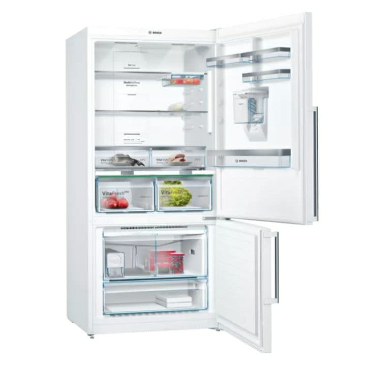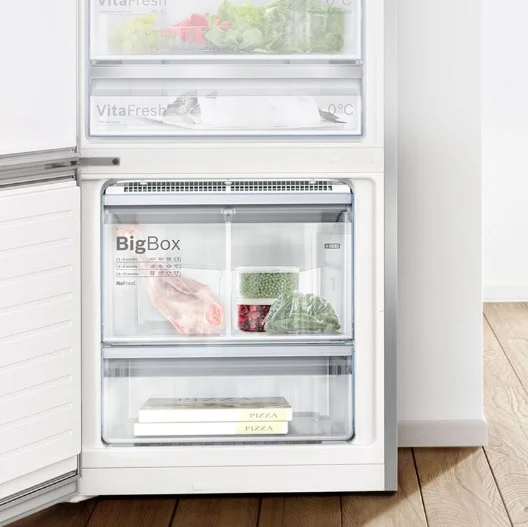 اولین گزینه در رابطه با این یخچال بوش سایز xxl آن می باشد و قفسه های آن بسیار بزرگ می باشند. رنگ برند این یخچال سفید می باشد که فوق العاده چشمگیر و جذاب است و جلوه ای بسیار خاص را به اشپرخانه شما خواهد داد. این یخچال بوش دارای دو درب بالا و پایینی می باشد. درب پایینی متعلق به فریزر و درب بالایی متعلق به یخچال می باشد. بر روی درب بالایی که درب یخچال می باشد یک محفظه ابریز وجود دارد که از طریق ان همواره اب خنک را در اختیار خواهید داشت. یکی دیگر از ویژگی های ظاهری این یخچال بوش وجود یک نمایشگر بر روی درب یخچال می باشد که از طریق آن می توانید وضعیت دمای یخچال و فریزر را مشاهده کنید. دستگیره های این یخچال از نوع برجسته می باشند و به رنگ نقره ای از رنگ خود یخچال می باشند. این یخچال دارای بدنه ای فوق العاده محکم می باشد و از ماندگاری زیادی بهره می برد و همچنین ضد اثر انگشت می باشد.