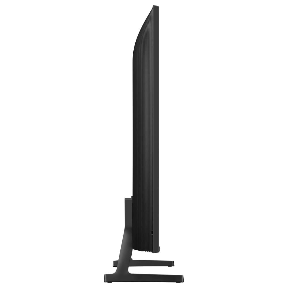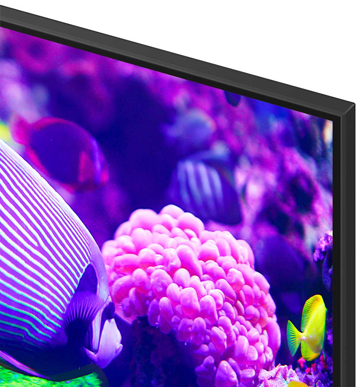 سامسونگ مثل همیشه این تلویزیونش را نیز بسیار زیبا عرضه بازار کرده است و نگاه های زیادی را به سمت خود خواهد کشید. با اولین نگاه به این تلویزیون متوجه حاشیه آن خواهیم شد حاشیه این تلویزیون در واقع خیلی باریک و خیلی پهن هم نیست و در حد متوسطی میباشد که دور تا دور تلویزیون را فرا گرفته است. این فریم یا به عبارتی دیگر این قاب، مشکی رنگ می باشد. رنگ قاب این تلویزیون مشکی است و بدنه آن نیز با رنگ مشکی دیزاین شده است که به سادگی با هر نوع کوراسیونی هماهنگ میشود. تلویزیون پیش روی شما دارای پایه های دو طرفه میباشد یعنی پایه در اطراف تلویزیون قرار گرفته است این پایهها حالت تخت مانندی دارند و بسیار محکم هستند. البته برای علاقمندان نصب تلویزیون بر روی دیوار باید گفت که می توانید به سادگی با حذف پایه تلویزیون و به وسیله براکت مناسب، تلویزیون را بر روی دیوار نصب کنید. قسمت پشتی این تلویزیون کاملا ساده و با رنگ مشکی ماتی طراحی شده است. در طرف راست این تلویزیون درگاه های ارتباطی تعبیه شده است که از طریق آن می توانید فلش و کابل ها را متصل کنید. این نمایشگر از بدنه ظریف و باریک برخوردار نمی باشد. همچنین طبق ادعای سامسونگ بدنه این تلویزیون بسیار محکم است و در برابر ضربه استحکام خوبی دارد.