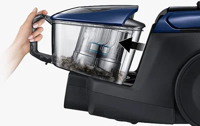جاروبرقی سامسونگ مدل SC18M3120VB برای جمع کردن گرد و غبار و آشغال ها دارای مخزن است و برای آن مخزن با ظرفیت مناسب و ۲ لیتر ساخته و در آن قرار داده اند. گنجایش عالی محسوب میشود و برای چندین بار کار جارو زدن بدون نیاز به تخلیه در هر بار عالی است. شفاف بودن دیگر ویژگی بخش مخزن بوده و جنس پلاستیکی مقاوم دارد. با وجود این قابلیت در هر لحظه میتوان از میزان پر و یا خالی بودن مخزن اطلاع پیدا کرد و نیازی به باز کردن و بیرون آوردن آن نیست و با یک نگاه ساده از بیرون جاروبرقی به محتوای داخلی آن میتوانید پی ببرید. برای کار تخلیه مخزن دستگاه زحمت زیادی لازم نیست. کار سختی نبوده و با فشردن یک کلید امکان خارج کردن مخزن از دستگاه برایتان فراهم میشود. به کمک دسته آن میتوانید مخزن را با خود حمل کنید و تخلیه نمایید. همچنین در صورت لزوم قابل شستشو نیز میباشد و تمیز و بهداشتی میشود. کار تخلیه بدون کثیف کاری و دخالت دست انجام میشود و بهداشتی و بدون بلند شدن گرد و خاک خواهد بود. به همین دلیل برای افراد دچار بیماری تنفسی مشکلی ایجاد نمیکند. همچنین در مقایسه با کیسه که در جاروبرقی های کیسه دار وجود دارد به صرفه تر است و طول عمر بیشتری داشته و نیاز به تعویض و خرید برای جایگزین کردن نخواهد داشت.
