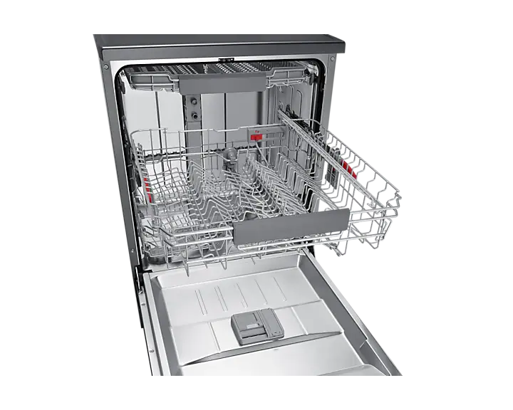 قفسه ها کشو هستند و از طریق ریل ها به سمت جلو کشیده می شوند. برای قرار دادن قاشق، چنگال، کارد، لیوان می توانید از کشو اول استفاده کنید. سایر ظرف ها چون بشقاب، کاسه و … را هم می توان با نظم خاصی در کشو دوم بچینید. قفسه ها جنس استیل دارند اما بر روی آن ها روکش پلاستیک وجود دارد. به همین دلیل در برابر رطوبت داخلی و زنگ زدگی مقاومت کامل دارد. حتی می توانند در برابر وزن سنگین طرف ها استحکام لازمه را ایجاد کنند. ماشین ظرفشویی سامسونگ مدل DW60A8050FG از 4 عدد پایه در زیر بدنه بهره برده است. پایه ها باعث ایجاد فاصله در بین بدنه و سطح می شوند. با این کار از بروز حوادث پیشگیری کرده و طول عمر محصول را افزایش می دهد.
