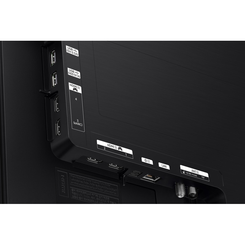 پورتها و درگاهای ارتباطی بر روی پنل پشتی تعبیه شده اند تا دسترسی کاربران به آن راحت باشد. همچنین بخش مدیریت کابل ها نیز از بی نظمی جلوی نمایشگر پیش گیری میکند و فضای آراسته ای را به شما تقدیم میکند. حضور ریموت کنترل خورشیدی سامسونگ با طراحی مینیمال خود توجه کاربران را به خود جلب کرده است و با قابلیت شارژ شدن از طریق نور خورشید و کابل USB-C یک همراه همیشگی و پایدار برای تلویزیون شما خواهد بود که بدون نیاز به باتری به شما امکان میدهد تا بدون وقفه از تماشای تلویزیون لذت ببرید.
