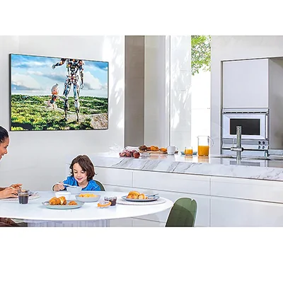 طراحی شیک و زیبا که شما را به ناب ترین تصویر می کشاند. ساخته شده با سبک مینیمالیستی بی دردسر از هر زاویه و سبکی بی حد و حصر که استانداردهای جدیدی را تعیین می کند. شما فقط غوطه ورترین تجربه سینمایی ما را خواهید دید. کنترل براق One Remote Control آن را ساده نگه می دارد و به شما این امکان را می دهد که به سرعت تمام محتوای مورد علاقه خود را از ست تاپ باکس تا کنسول بازی، برنامه ها و حتی تلویزیون زنده جستجو کنید. انعکاس فیلم یا موسیقی از تلفن هوشمند خود به تلویزیون به سادگی یک ضربه است. هنگامی که با تلفن هوشمند خود روی تلویزیون ضربه می زنید، تلویزیون ضربه را حس می کند و به طور خودکار منعکس می شود. بنابراین جابجایی به تلویزیون و ادامه لذت بردن از محتوای مورد علاقه خود، سریع و آسان است. همچنین فناوری Multi View صفحه تلویزیون شما را به دو قسمت تقسیم می کند و محتوایی را که تماشا می کنید در یک طرف قرار می دهد و صفحه نمایش تلفن همراه شما را در طرف دیگر منعکس می کند. این به این معنی است که دیگر لازم نیست برای نگاه کردن به تلفن خود از صفحه تلویزیون دور نگاه کنید. تلویزیون سامسونگ QLED با SmartThings کار می کند تا شما را در کنترل خانه هوشمند خود قرار دهد. QLED با دستگاهها و حسگرهای IoT پیوند میخورد تا بتوانید چراغها را روشن کنید، ببینید چه چیزی داخل یخچال است و حتی جاروبرقی ربات را درست از روی مبل خود راهاندازی کنید. این یک دنیای کاملا جدید است. صفحه نمایش براق و به خوبی صاف است. شما واقعا باید مراقب باشید که اثر انگشت روی صفحه نمایش با حاشیه باریک ایجاد نشود.صفحه نمایش را می توان روی پا یا روی دیوار قرار داد. این کار را میتوان محکم روی دیوار انجام داد و سپس تمام دستگاههای خارجی را با یک کابل تقریباً شفاف به جعبه اتصال متصل میکنید تا صفحه نمایش مانند یک قاب با فضای داخلی شما ترکیب شود.