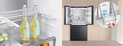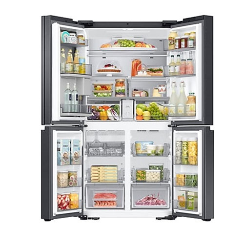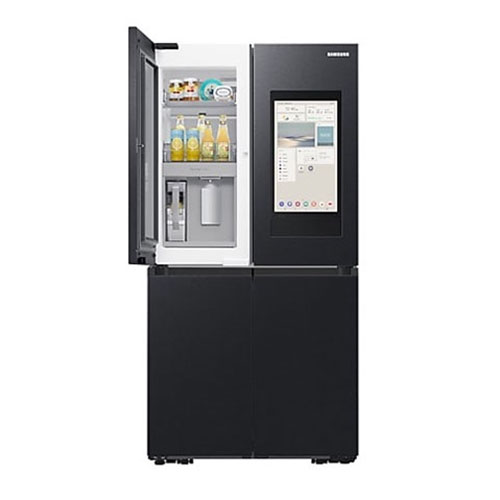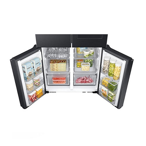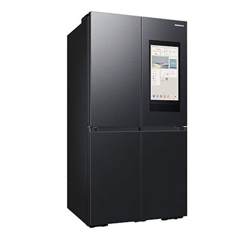 ساید بای ساید سامسونگ که در این جا به شرح خصوصیات آن میپردازیم از نظر طراحی عالی است. از سری تولیدات Bespoke French Door به شمار می آید. دارای چهار درب است و دو درب در بالا برای یخچال و دو درب در پایین برای بخش فریزر آن نصب شده اند. در واقع طراحی 4 Door – T Style دارد. هم ظاهر زیبا و هم کاربری فوق العاده ای دارا میباشد. رنگ به کار برده شده برای بدنه خارجی این دستگاه دودی است. این رنگ دودی باعث شده تا جلوه ای مدرن، لوکس و هماهنگ با آشپزخانه را ایجاد نماید. به خوبی با هر نوع دکوراسیونی هماهنگی دارد. برای ساخت بدنه یخچال فریزر ساید سامسونگ از فلز چند لایه با پوشش ضد لک استفاده شده است. بدنه ای مقاوم دارد که در برابر رطوبت و ضربه مقاومت بالایی دارا میباشد. با وجود قابلیت ضد لکه همیشه تمیز و بدون وجود اثری از رد اثر انگشت و لکه باقی خواهد ماند. کار تمیز کردن آن به راحتی و تنها با یک دستمال کشی مرطوب انجام خواهد گرفت. دستگیره های این یخچال از نوع مخفی یا همان Hidden Handle است. این دستگیره ها هم در زیبایی کلی بدنه نقش دارند و هم باعث باز و بسته شدن راحت درب ها میشوند. بخش متمایزی که این دستگاه به نسبت دیگر یخچال فریزرهای ساید بای ساید دارد وجود نمایشگر بزرگ و لمسی 21.5 اینچی Family Hub نصب شده بر روی آن است. این مانیتور بر روی درب سمت راست یخچال به صورت یکپارچه وجود دارد. جلوه ای کاملا هوشمند به دستگاه داده است. از نظر ابعاد یخچال فریزر ساید بای ساید استانداردی به شمار می آید. هرچند ظرفیت بالایی دارد اما از حداکثر فضای ذخیره سازی آن استفاده شده و بر ابعاد آن افزوده نشده است. از عرض حدودا 912 میلی متر، ارتفاع 1780 میلی متر و عمق 716 میلی متر بهره مند میباشد.