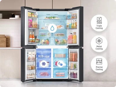 یخچال سامسونگ مدل RF71 از سیستم خنک کننده سه گانه Triple Cooling Plus بهره مند بوده که شامل سه مدار خنک کننده مجزا برای یخچال، فریزر و بخش موسوم به FlexZone میباشد. این سیستم دما و رطوبت را برای هر بخش به صورت مجزا و مستقل کنترل میکند. دارای مزیت هایی بوده که اصلی ترین آن جلوگیری از ترکیب بوها درون یخچال فریزر است. مواد غذای بخصوص نوشیدنی های درون پارچه که بدون درب و پوشش هستند بوی دیگر مواد غذایی درون یخچال را نخواهند گرفت. طعم آن ها تغییر پیدا نمیکند. بوی نامطبوع در رمان باز کردن درب به مشام نخواهد رسید. از دیگر مزایای این سیستم خنک کننده این است که باعث یکنواخت شدن دمای داخلی میشود. نوسانات دمایی را به حداقل میرساند.