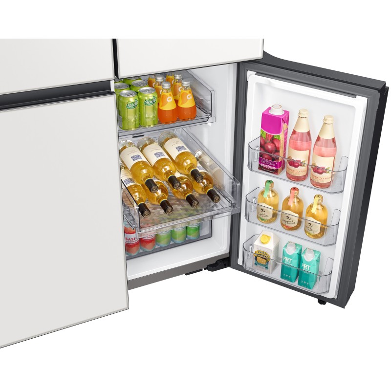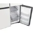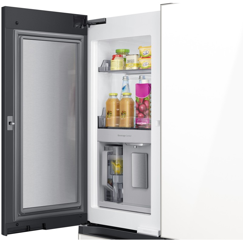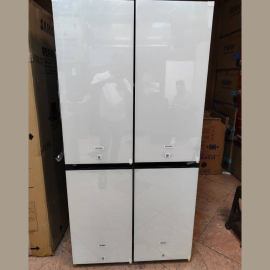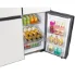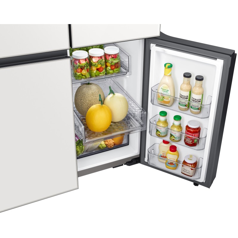 یخچال سامسونگ RF71 این یخچال door in door را با رنگ محبوب سفید عرضه کره است. این رنگ سفید ظاهری مینمال و بسیار خاص را در فضای آشپزخانه شما ایجاد خواهد کرد و به سادگی با تمامی محصولات دیگر آشپزخانه شما هماهنگ خواهد شد. این یخچال سامسونگ متشکل از پنچ درب میباشد. 3 درب بالا یک درب مربوط به درب بار یخچال و 2 درب پایین مربوط به فریزر میباشد. طراحی اینستا ویو در این یخچال پشتیبانی نمی شود یعنی درب شیشهای بر روی درب یخچال وجود ندارد. دستگیره های این یخچال کاملاً مسطح و مخفی می باشند به همین سبب ایجاد ظاهری مرتب در یخچال شده است. بدنه این یخچال کاملا ساده می باشد و هیچ محفظه یخساز، آبریز و پنل لمسی را مشاهده نخواهید کرد. سامسونگ قسمت یخ ریز و ابریز را در قسمت داخلی سمت چپ یخچال RF71 تعبیه کرده است. قسمت ابریز در داخل یخچال درب مخصوص به خودش را دارد که متصل به اب شهری است و می توانید همواره به اب خنک دسترسی داشته باشید. پنل LCD هم نیز در داخل یخچال قرار گرفته است و در قسمت پایینی قرار گرفته تا حتی افرادی هم که معلول یا حرکت محدودی دارند قادر به تنظیم و کنترل باشند. این یخچال از سیستم یخ ساز نیز بهره می برد که به صورت اتوماتیک خواهد بود و یخ حبه ای و خرد را تولید خواهد کرد. ازنظر بدنه این یخچال بدنه ای کامل محکم از جنس فولاد ضد زنگ دارد که سالهای سال بدون هیچ آسیب و زنگ زدگی سالم خواهد بود.